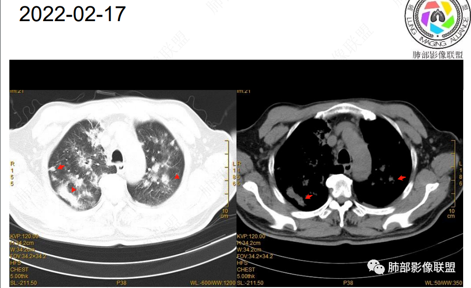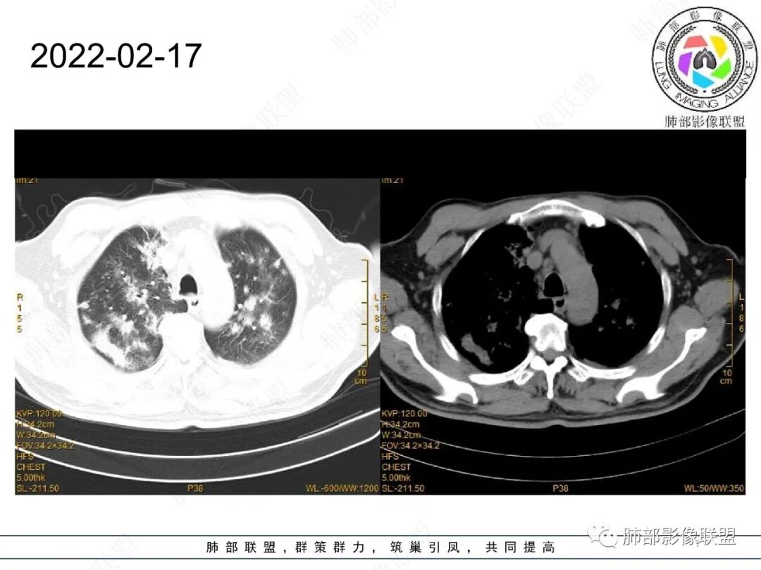 2022.2.17CT显示两肺中内带多发结节影、斑片影、条索影,部分病灶侧向融合与胸膜平行。部分病灶沿着支气管血管束分布、其内支气管稍扩张。部分病灶呈反晕征。大部分病灶边界显示清晰,部分病灶周围可见边界不清的GGO。2022.4.12CT显示两肺中内带多发结节影、条索状、条带状高密度影,边界收缩平直凹陷,大部分病灶沿着支气管血管束分布,亦有位于胸膜下侧向融合与胸膜平行的病灶。总体与第一次CT对比两肺病灶明显吸收。