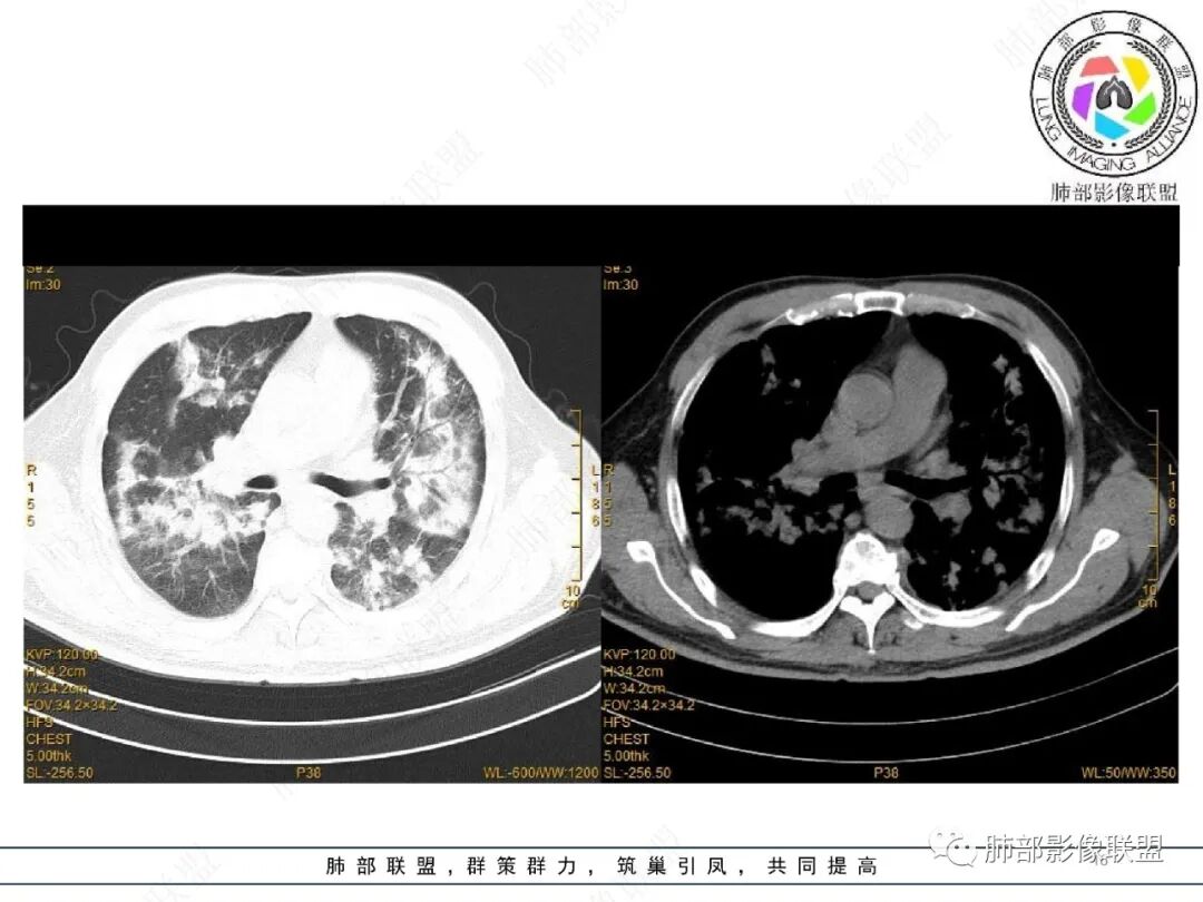谢加平: 两肺叶多发斑片实变影,边缘模糊,沿支气管血管束对称分布,血管束不清,抗髓过氧化酶抗体阳性,支持血管炎表现,治疗后复查双肺病灶较前吸收好转,范围减少,病灶边缘收缩,支气管有牵拉打张,伴随0P肺炎改变。