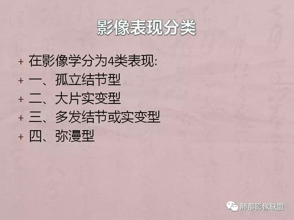 根据宿主的不同免疫状态,影像学差异很大,无免疫抑制的隐球菌病,大概分为4型:孤立结节块型,大片实变型,多发结节或实变型,弥漫型。