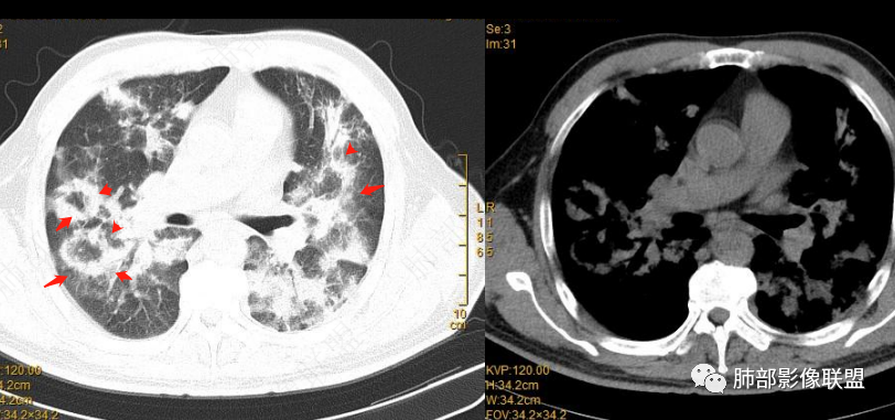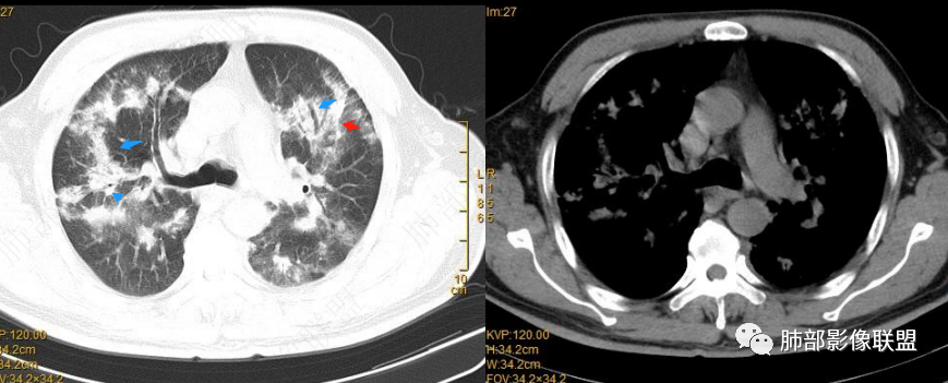 龚小萌: 双肺弥漫分别斑片影和结节影,沿支气管分布,见反晕征,复查明显吸收,抗髓过氧化物酶抗体阳性,影像符合机化性肺炎样改变,血管炎所致?