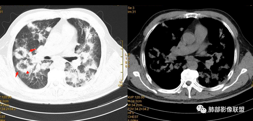相对而言:已经融合的,边缘平直、光滑一些,周围纤维化明显一些,没融合的边缘模糊一些,周围GGO多一些;提示融合的病灶更早,已经开始有纤维化改变特点;而没融合的属于后发一些的病灶,纤维成分还不够