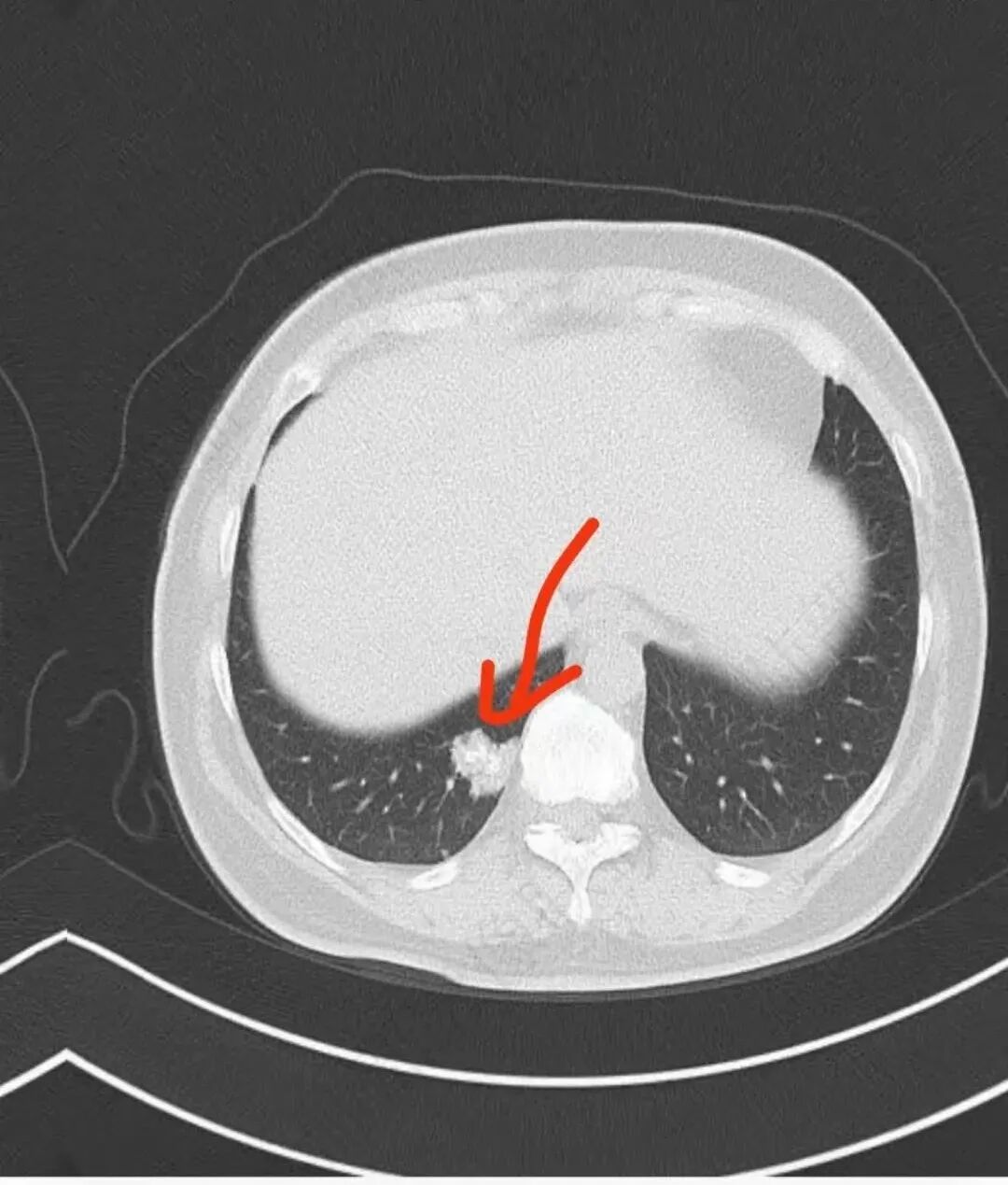 右肺下叶后基底段结节,形态不规则,有分叶和毛刺,内可见爆米花样钙化,实性成分有强化,绿色无坑肯定考虑错构瘤,晨读估计不会这么简单,所以考虑腺癌?转移性腺癌?鉴别结核