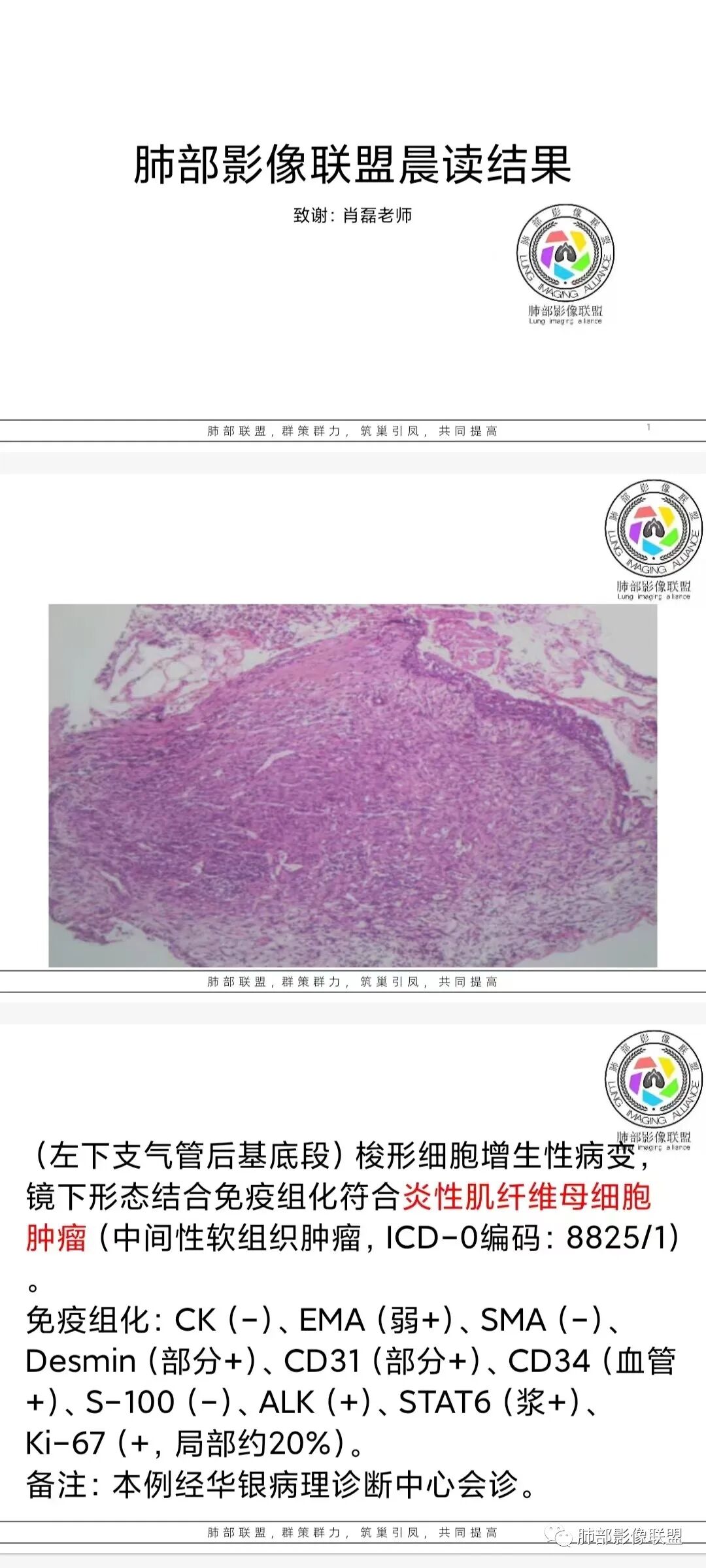肺炎性肌纤维母细胞瘤是一种多发生于肺的间叶性肿瘤,以往临床将称为炎性假瘤、浆细胞肉芽肿、炎症性纤维肉瘤及组织细胞炎性假瘤等。2002年世界卫生组织(WHO)软组织肿瘤国际组织学分类专家组建议将其命名为炎性肌纤维母细胞瘤(Inflammatory myofibroblastic tumor,IMT),定义为“由分化的肌纤维母细胞性梭形细胞组成的,常伴大量浆细胞和/或淋巴细胞的一种肿瘤”。