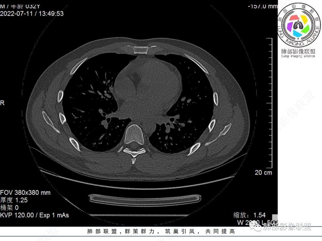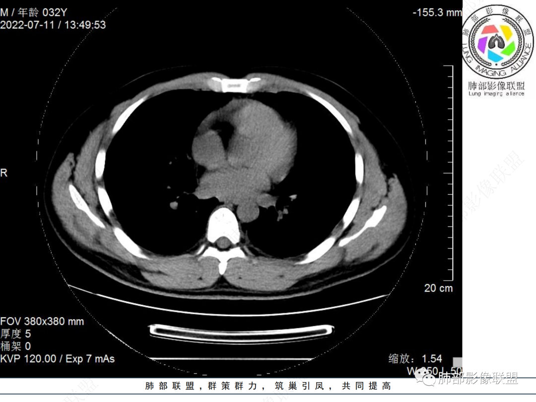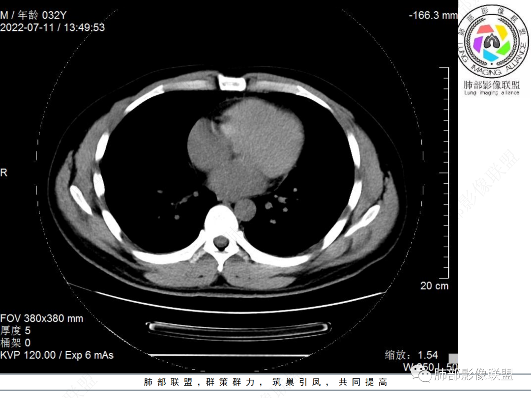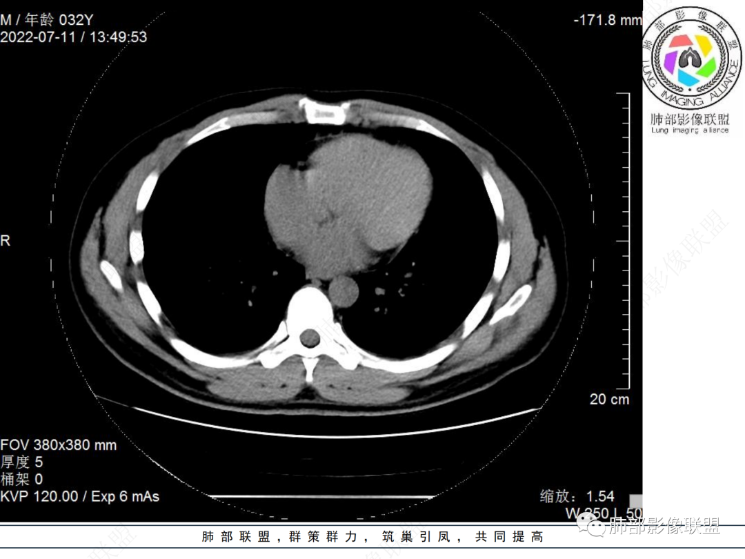 IMT常表现为边缘清晰的周围型结节或肿块,一般体积相对较大。大约10%-20%发生于支气管及气管腔内,表现为中央型病变,一般为单发。IMT胸部CT显示90%为单发结节或肿块。
