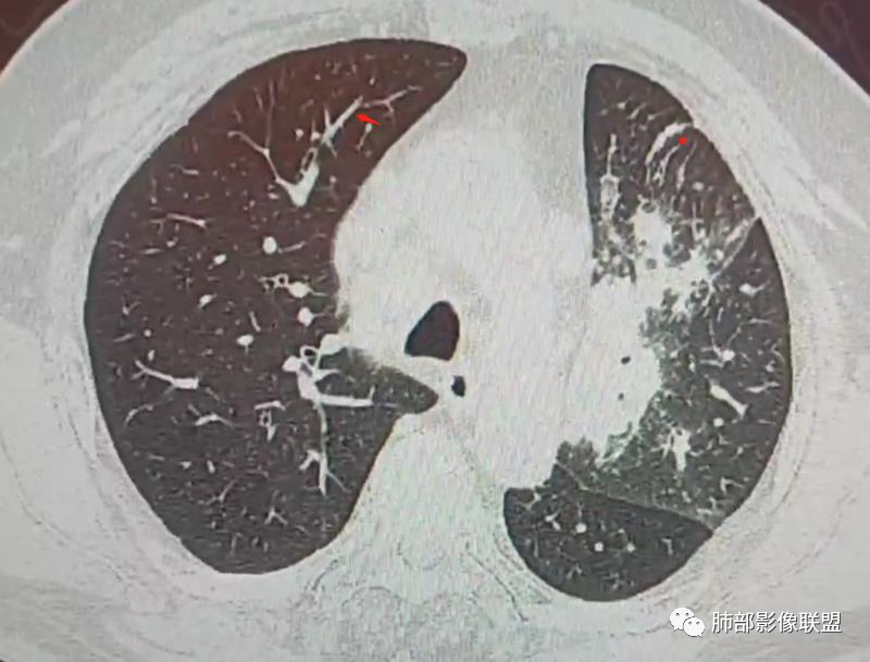 三、影像表现:左肺上叶多发片状高密度影,散在,边缘模糊,支气管壁稍增厚,中轴间质、小叶间隔增厚、有结节感,左肺上叶前段病灶可见胸膜增厚,部分小支气管不能分辨;右肺上叶后段混合磨玻璃结节,边界清,邻近胸膜凹陷;纵膈淋巴结肿大;心包增厚;左侧少量胸水。此外,扫及右侧胸腔内甲状腺肿;左侧肩胛骨旁肌群内脂肪瘤。