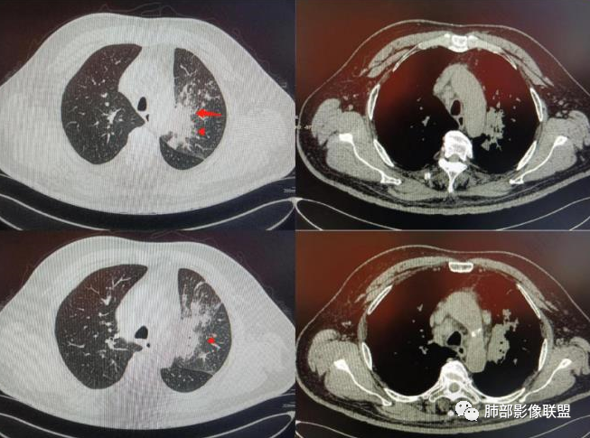 衡妈:左肺门见大片状不规则软组织密度,左肺上叶近端支气管管壁僵直,分支堵塞,病灶周围结构紊乱,小叶间隔增厚且伴结节感,考虑淋巴管炎;纵隔淋巴结肿大。炎性指标正常,考虑肿瘤性病变,腺癌伴周围癌性淋巴管炎可能,鉴别结核。