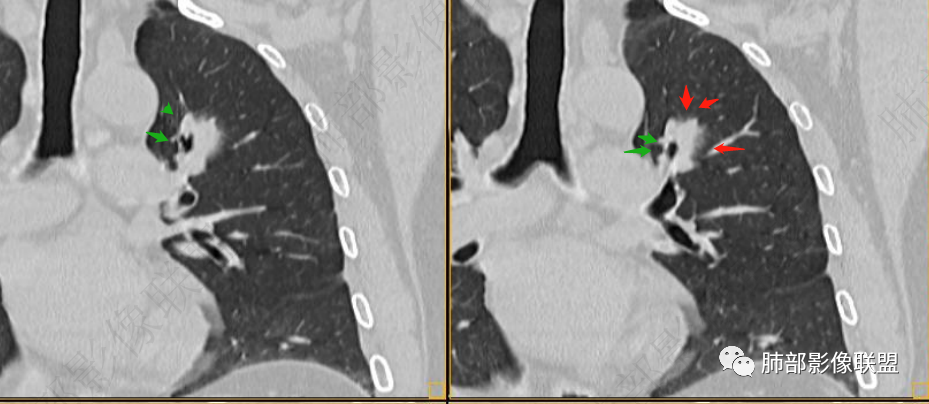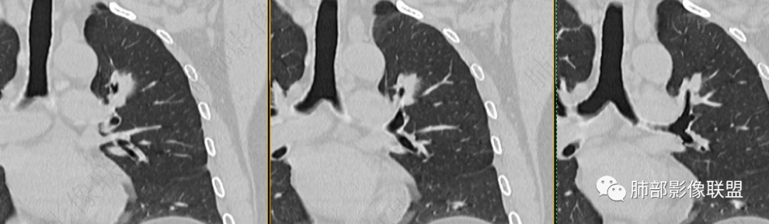 1、连续3年观察,病灶逐步增大,符合惰性恶性肿瘤。2、支气管壁增厚,腔内内壁无变化——病灶长轴沿支气管周围蔓延;朝外走,内侧没有,提示病灶间质为主,与支气管无关。