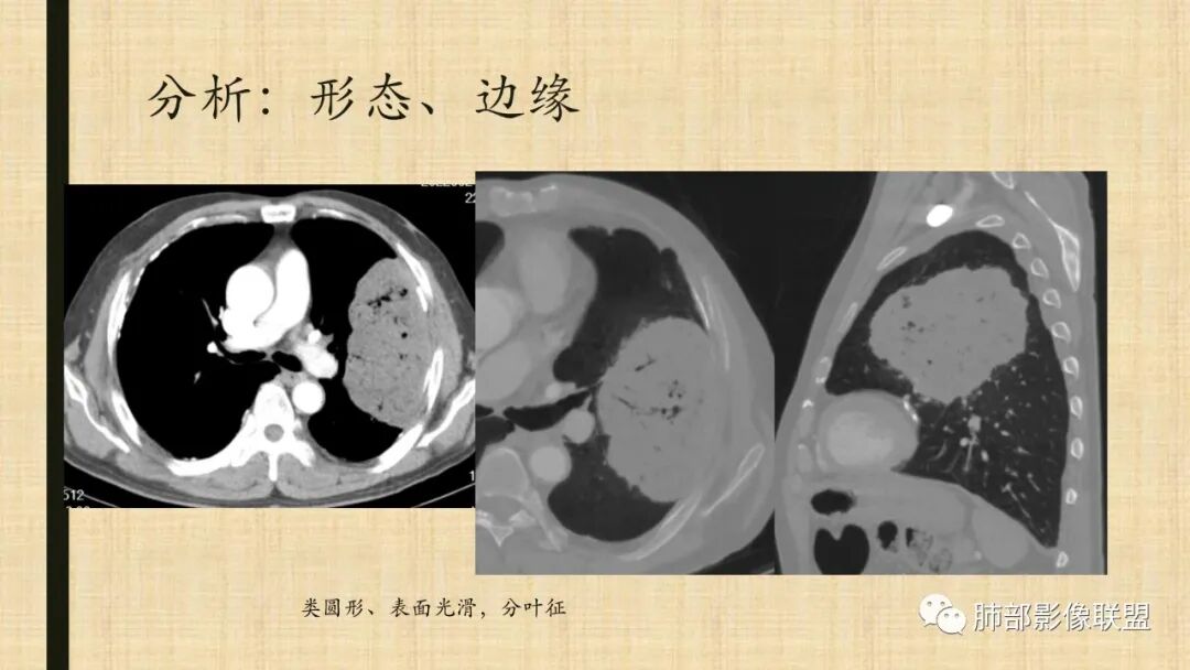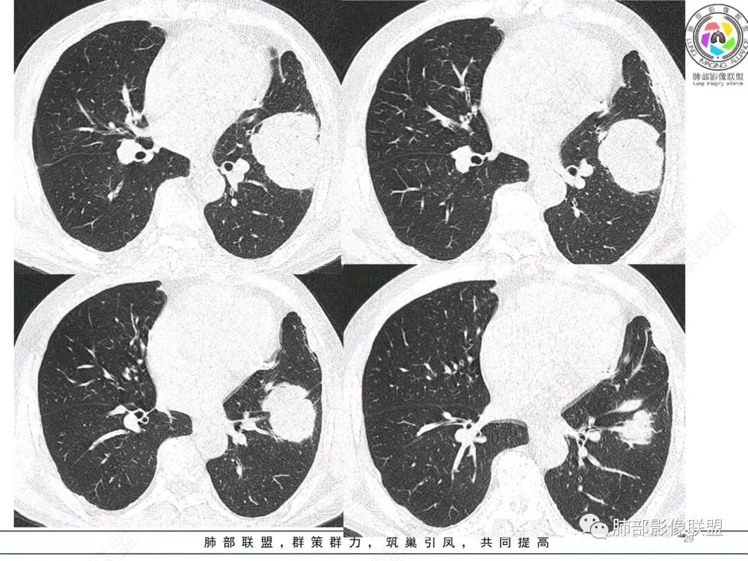 3)肿块边界和边缘:多较清楚,呈圆形、类圆形,且由于肿块生长速度不均匀,可见分叶,毛刺少见。有报道肿块周围毛玻璃影是多形性癌特征表现。