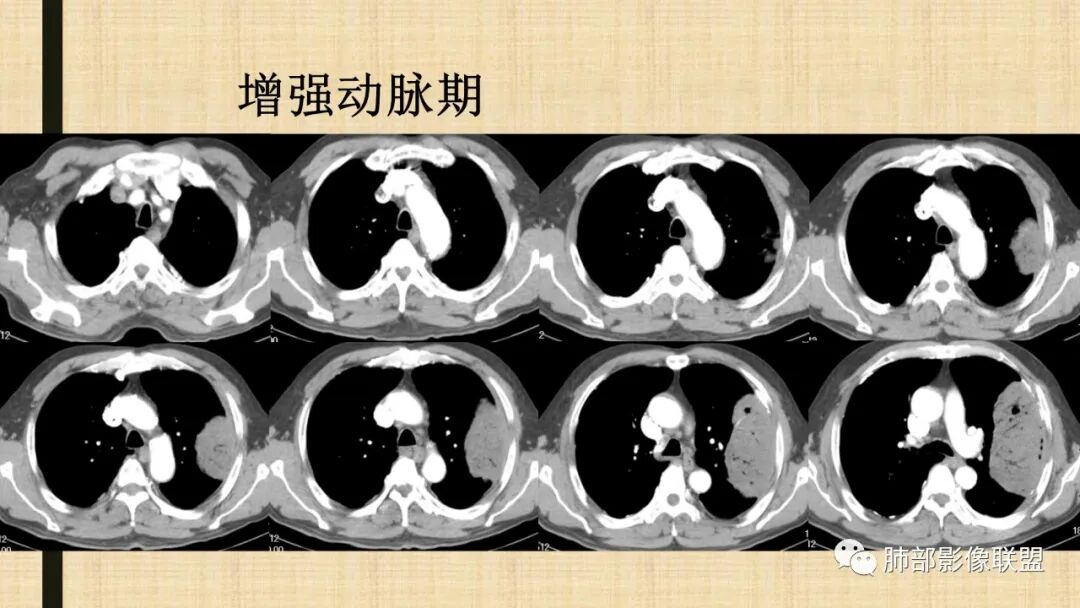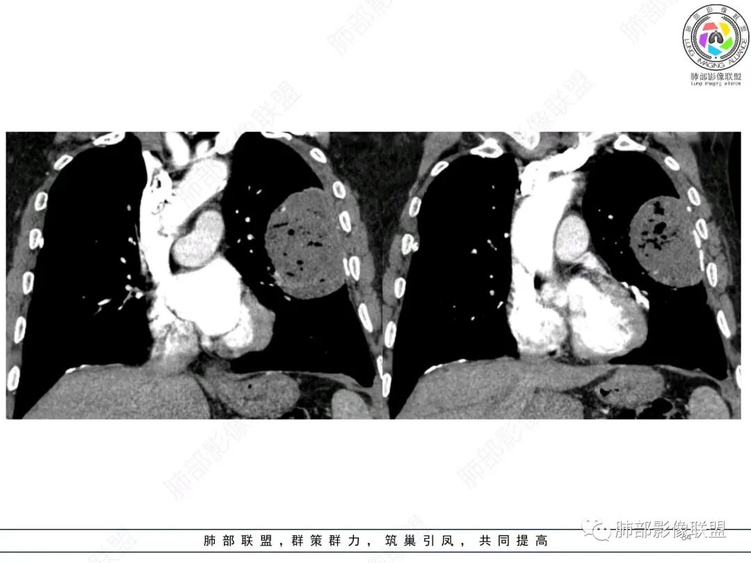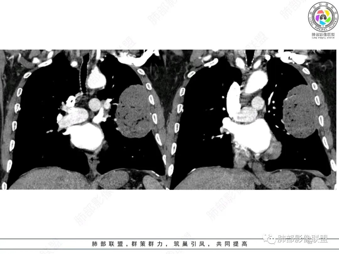 1)部位:周围型或中央型软组织肿块,以周围型为多见,且肿瘤多位于肺上叶。如本例:该肿瘤位于左肺上叶。