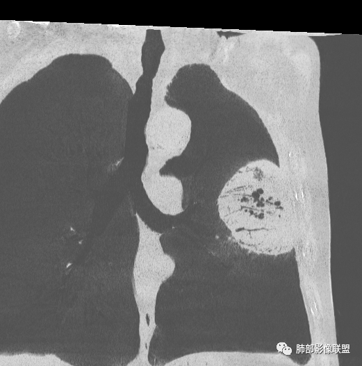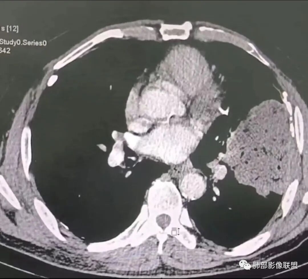 左肺上叶大肿块,膨胀性生长,边界清,密度较低,见部分坏死区,强化弱,肿块见支气管充气V扩张征,分布僵直,枯树枝特点,另一个重要特点血管造影征,淋巴瘤,肿块长轴与胸膜平行,与隐球菌鉴别,隐球荚膜抗原检查,明确诊断经皮肺穿刺。另胸膜钙化(问诊既往有无患胸膜炎病史)。