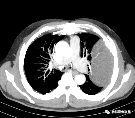 左肺紧贴胸膜巨大肿块,跨叶裂生长,密度均匀,边缘清晰,内支气管略扩张,增强见血管影,强化不明显,胸膜栽赃,钙化,考虑淋巴瘤。