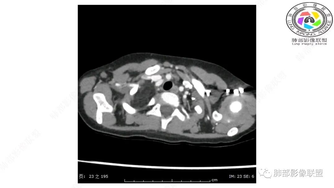 内部血管明显,部分病灶密度增高,单纯脂肪瘤不支持。可惜的是:没有提供CT值:是否强化?如果强化,警惕恶性;胸腺肯定不符合,胸腺会将上腔静脉朝后推移。