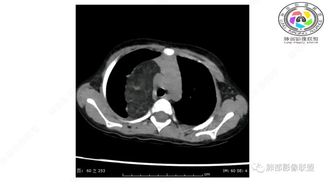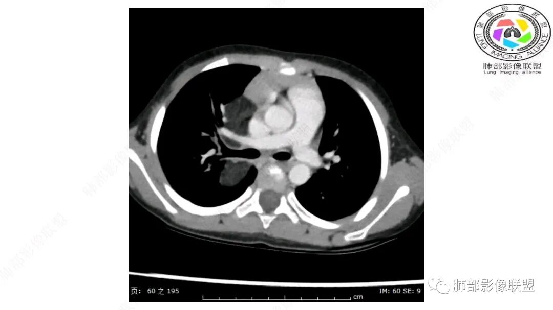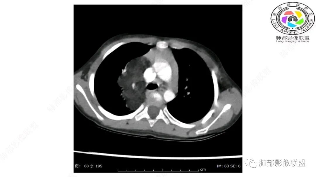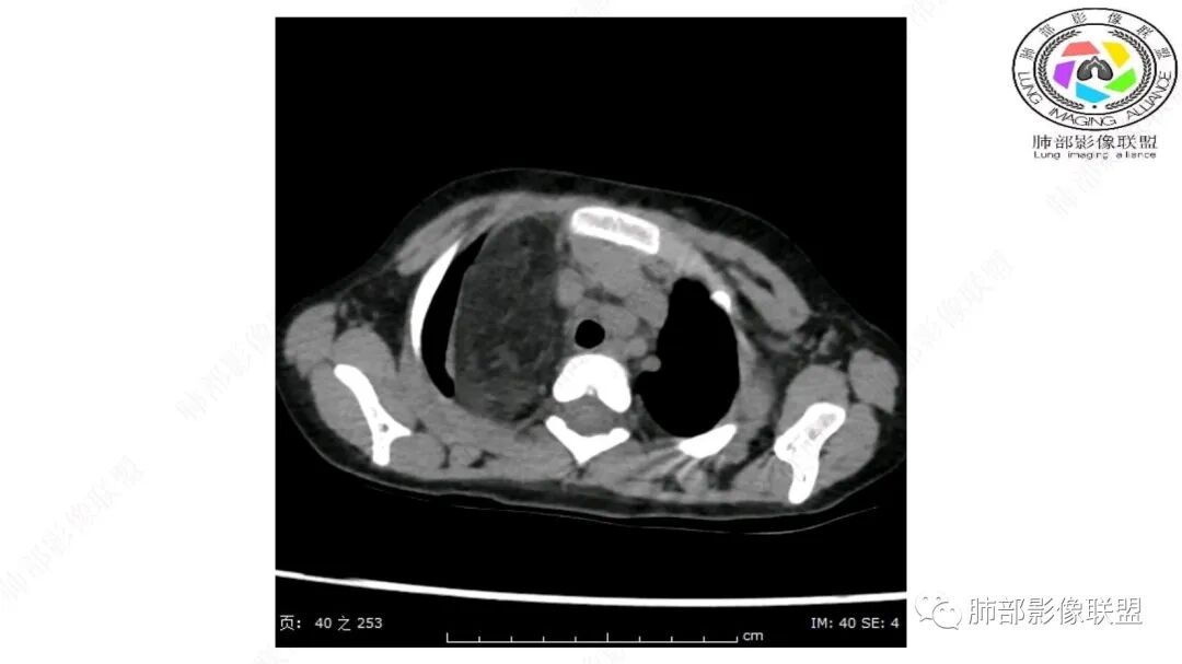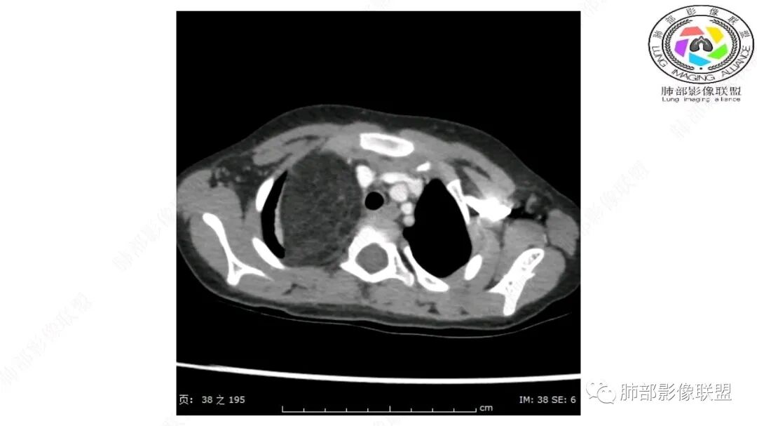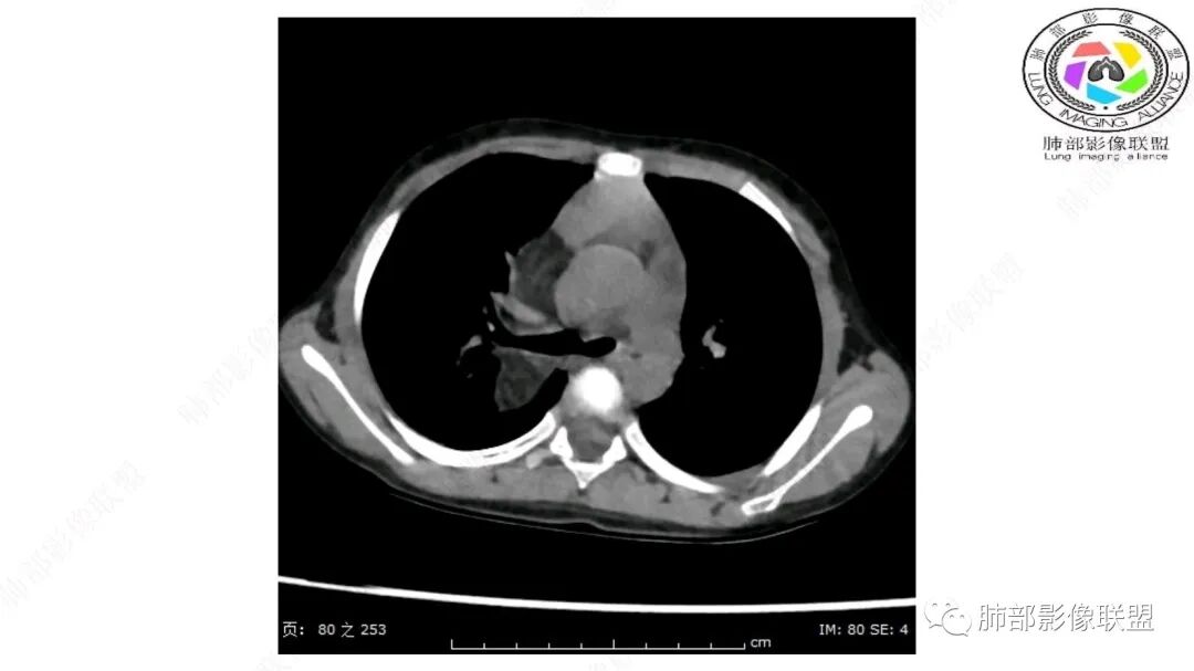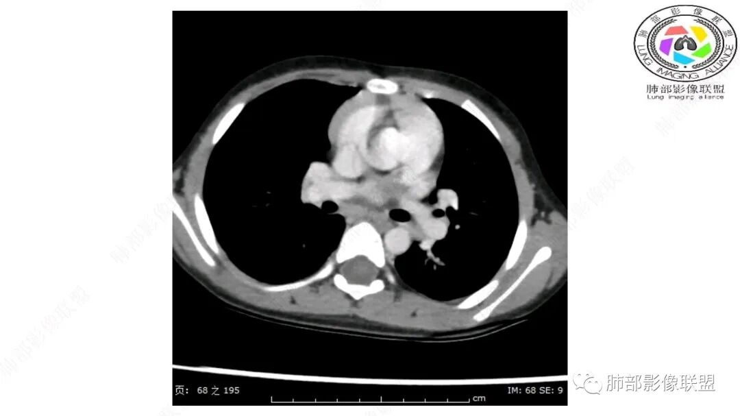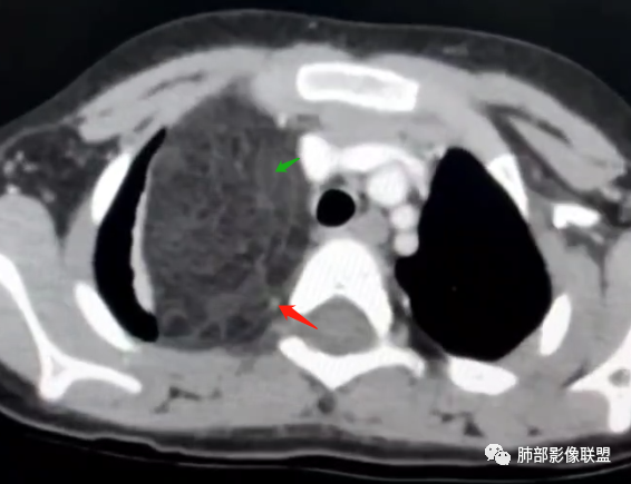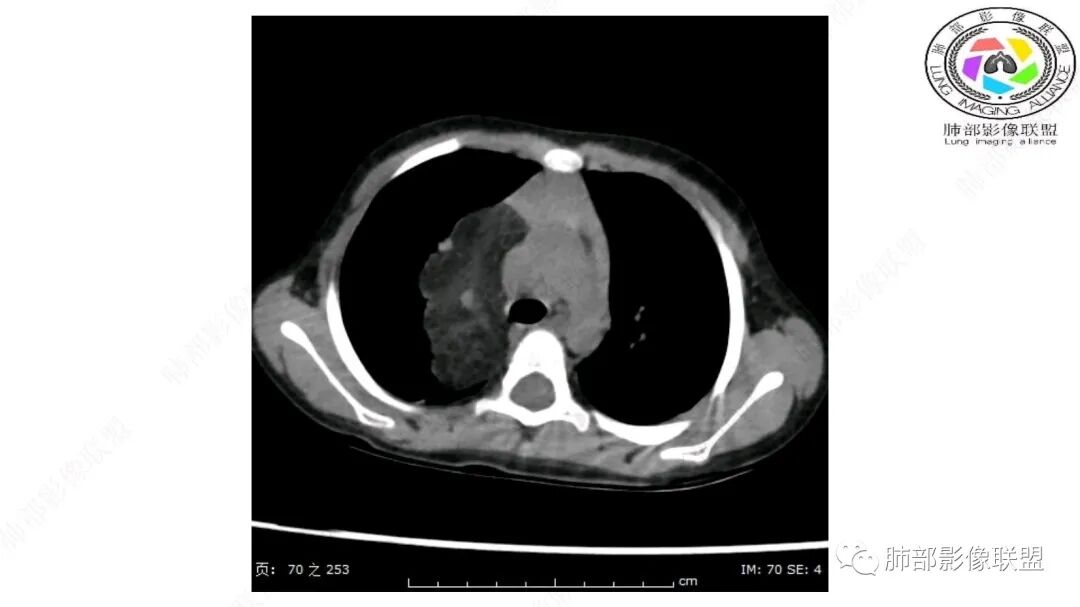 病灶属于交界区,主体位于肺内,占位效应明显,前方突入胸壁,胸腺受压变形,胸膜显示欠清楚;病灶包绕上叶肺动脉;似乎有体动脉供血。符合肺内的点:包绕上叶肺动脉分支;符合纵隔的点:前方似乎突入胸壁,与胸腺关系比较密切,但是与上腔静脉的关系提示病灶不支持纵隔来源,前纵隔的常规会将上腔静脉受压后移、外移,这是不符合的。