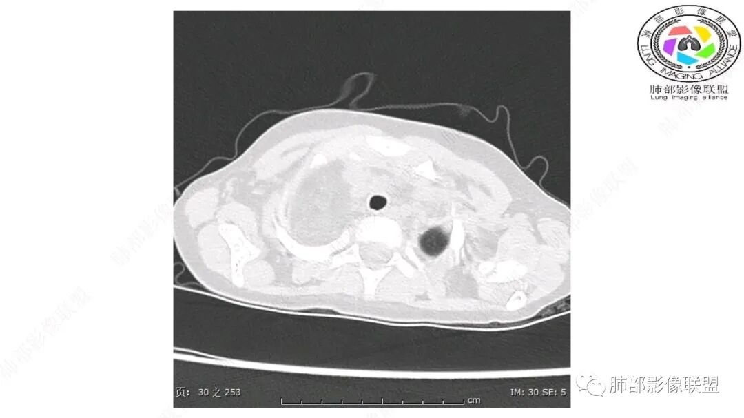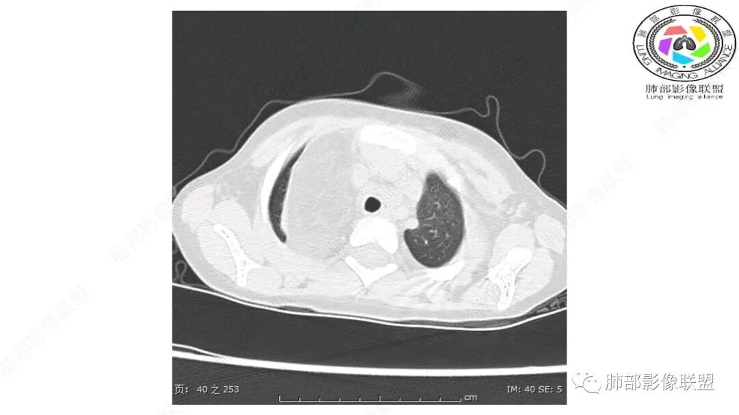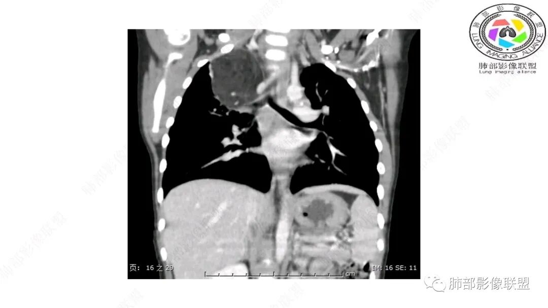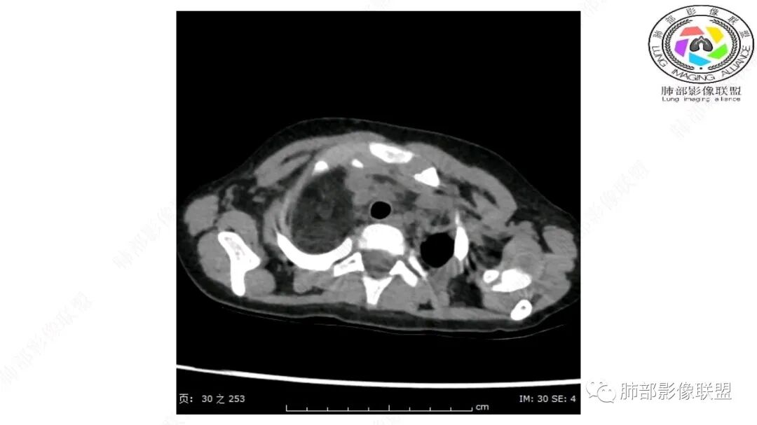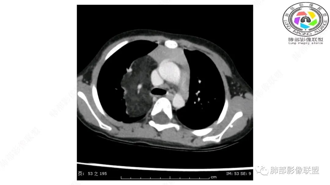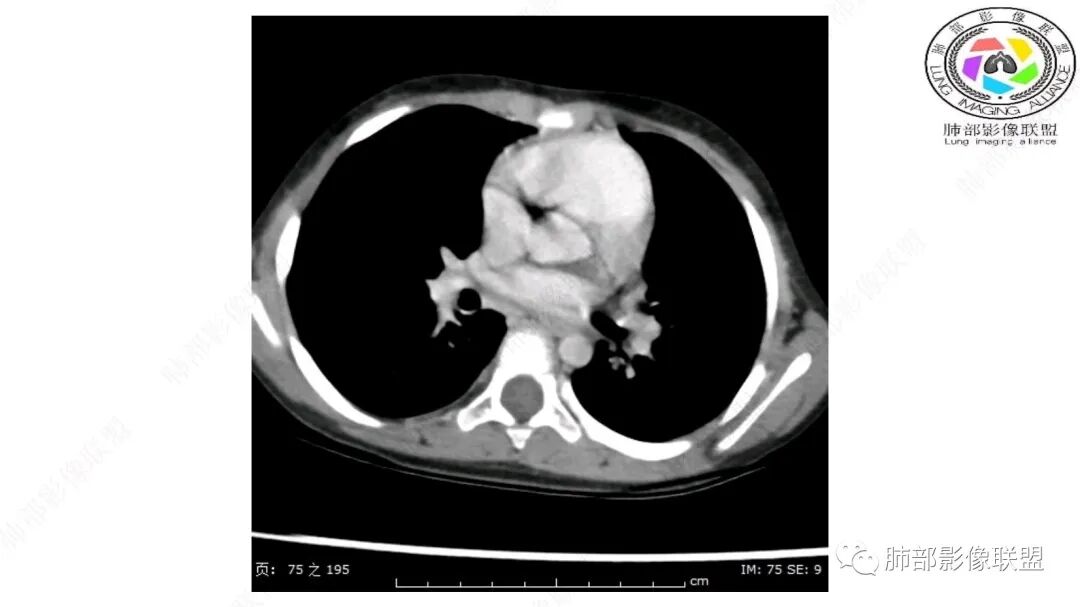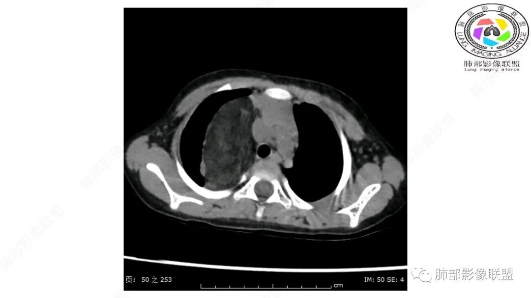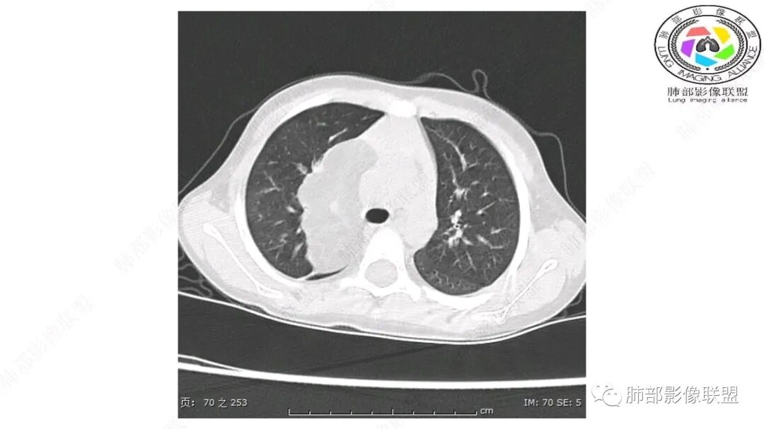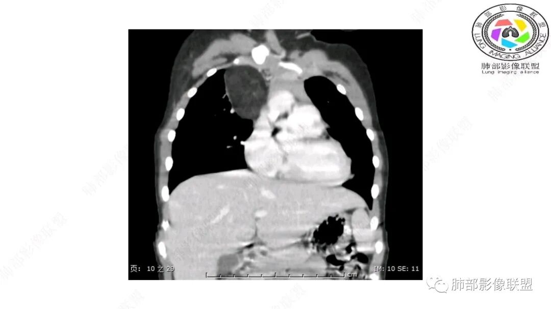 病灶属于交界区,主体位于肺内,占位效应明显,前方突入胸壁,胸腺受压变形,胸膜显示欠清楚;病灶包绕上叶肺动脉;似乎有体动脉供血。符合肺内的点:包绕上叶肺动脉分支;符合纵隔的点:前方似乎突入胸壁,与胸腺关系比较密切,但是与上腔静脉的关系提示病灶不支持纵隔来源,前纵隔的常规会将上腔静脉受压后移、外移,这是不符合的。