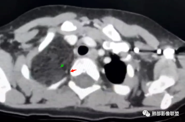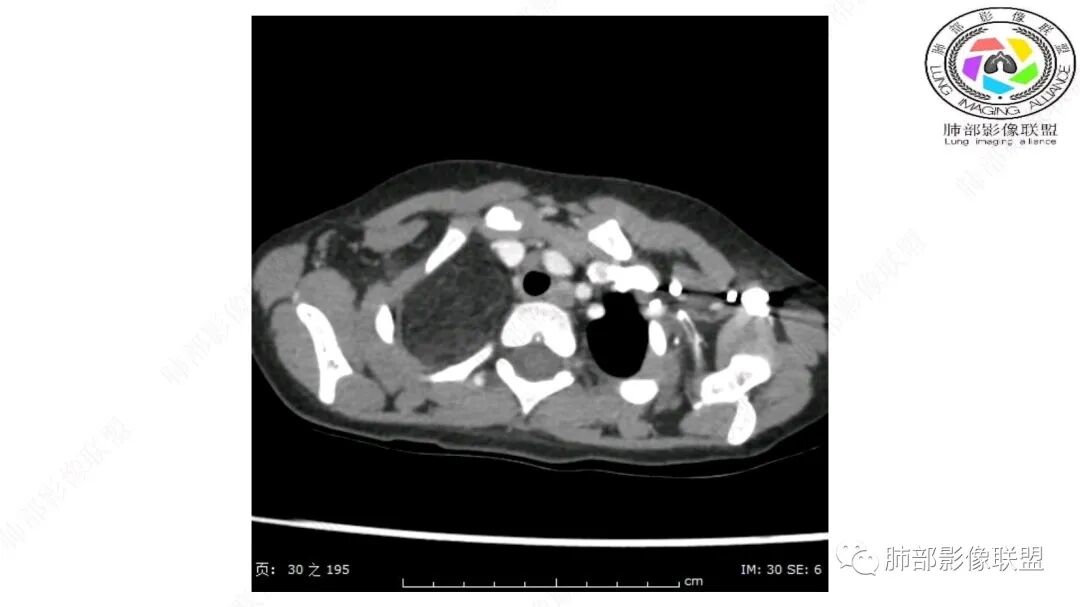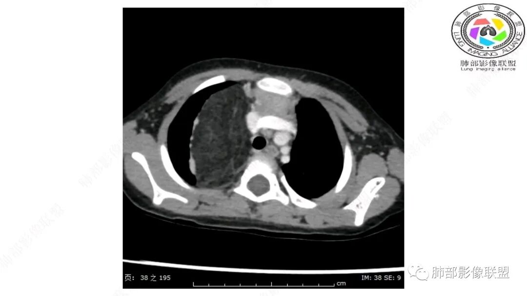 1.右上肺-纵隔交界区巨块影,主体位于右肺一侧,紧贴胸腺、头臂干、右锁骨下动脉、上腔静脉、奇静脉等,不能分离,但病灶整体边界清楚。注意上述相邻腔静脉等结构未见受压变形,纵隔亦未见明显向左推移,至少提示两点: