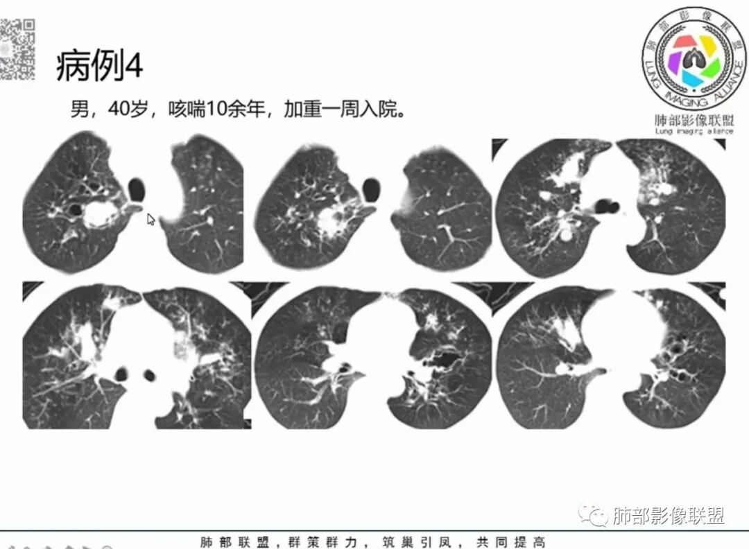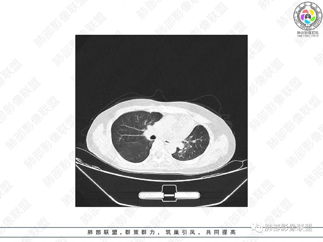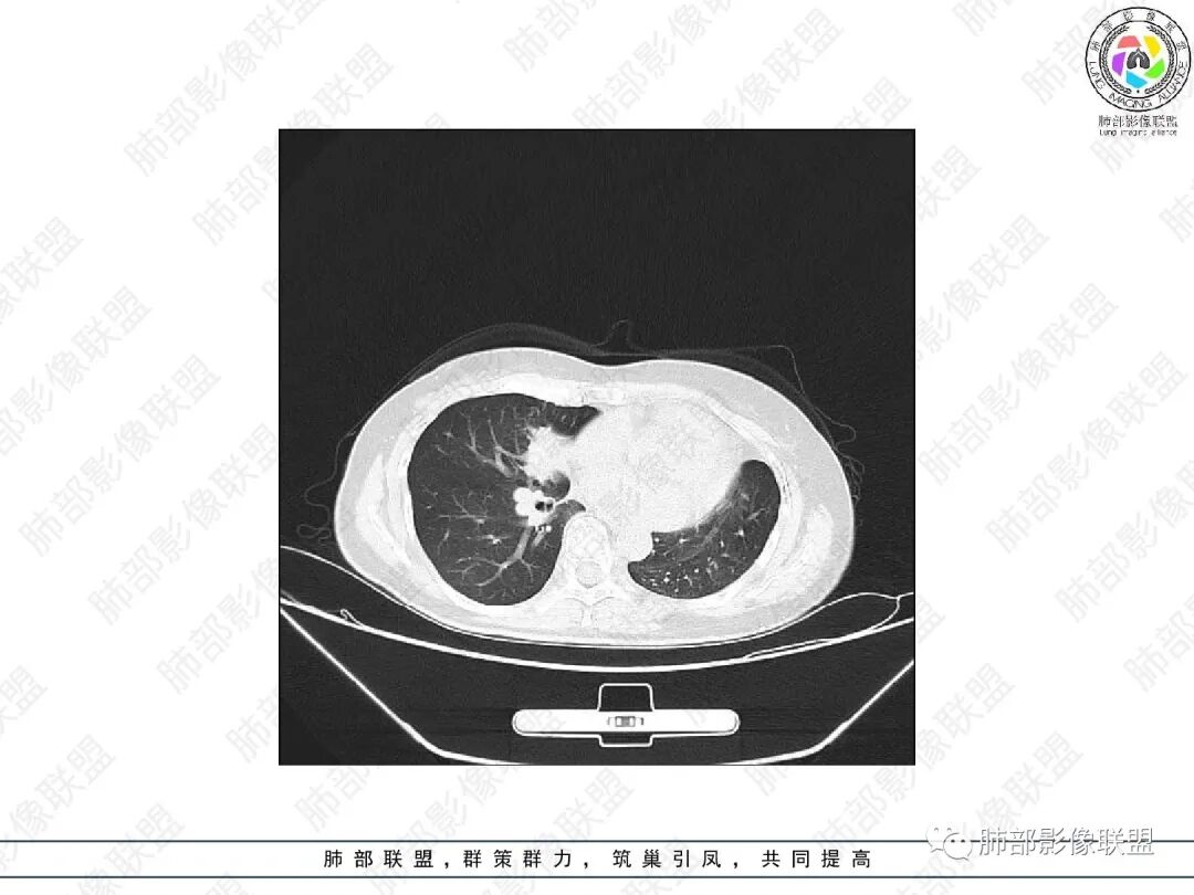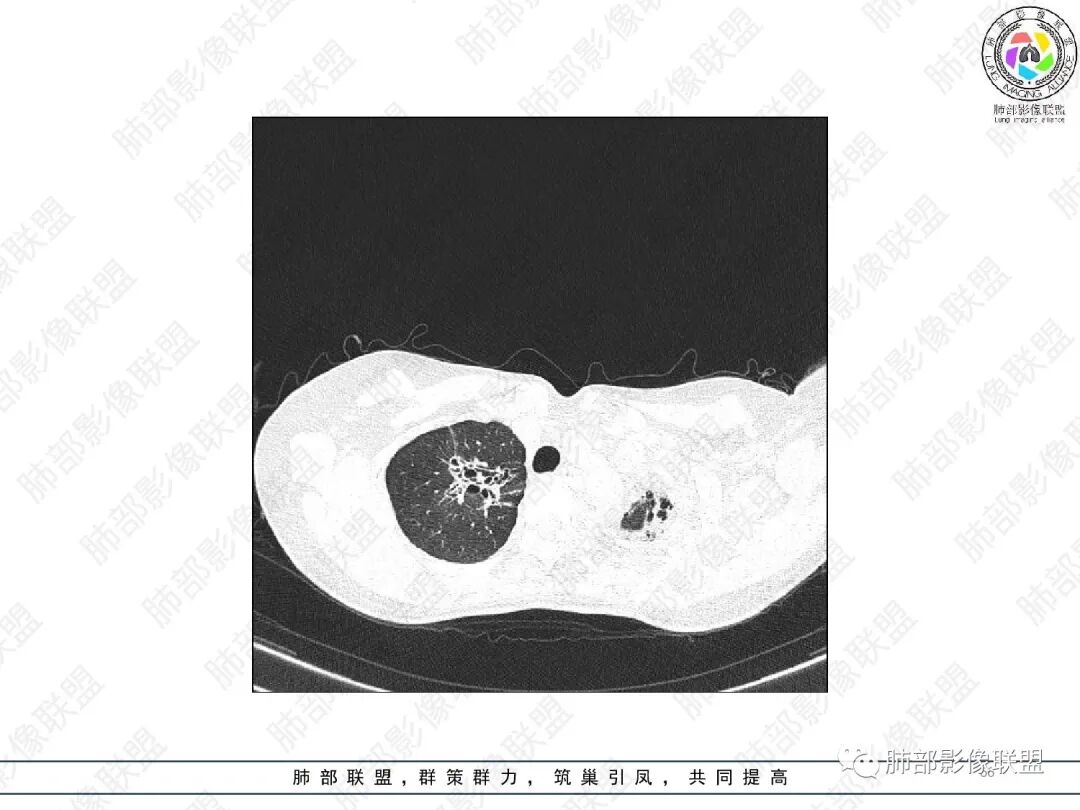 女性51岁,咳嗽咳痰半年,左肺原诊结核手术病史;现右肺尖见不规则团块影,内部可见略高密度影,右肺中央亦见相仿病灶,上述病灶周围可见小片影,常规考虑结核,鉴别NTM。