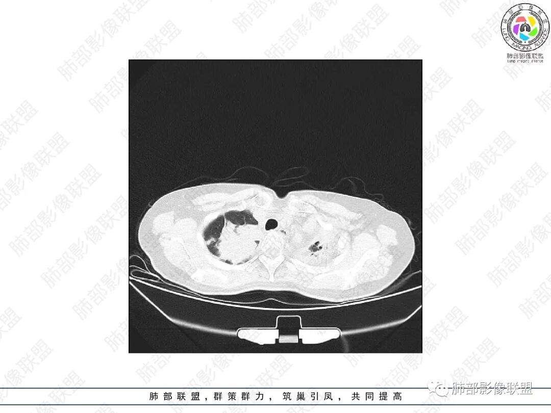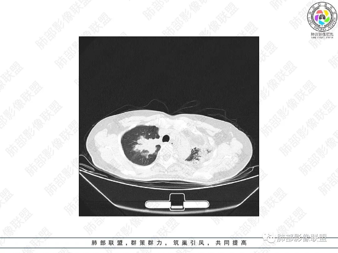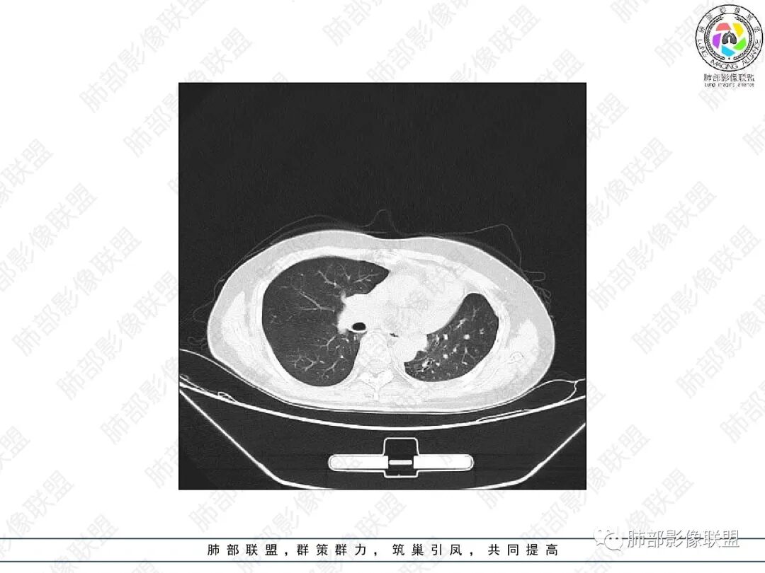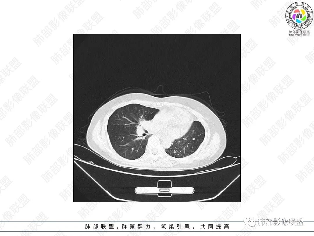 女性51岁,咳嗽咳痰半年,左肺原诊结核手术病史;现右肺尖见不规则团块影,内部可见略高密度影,右肺中央亦见相仿病灶,上述病灶周围可见小片影,常规考虑结核,鉴别NTM。