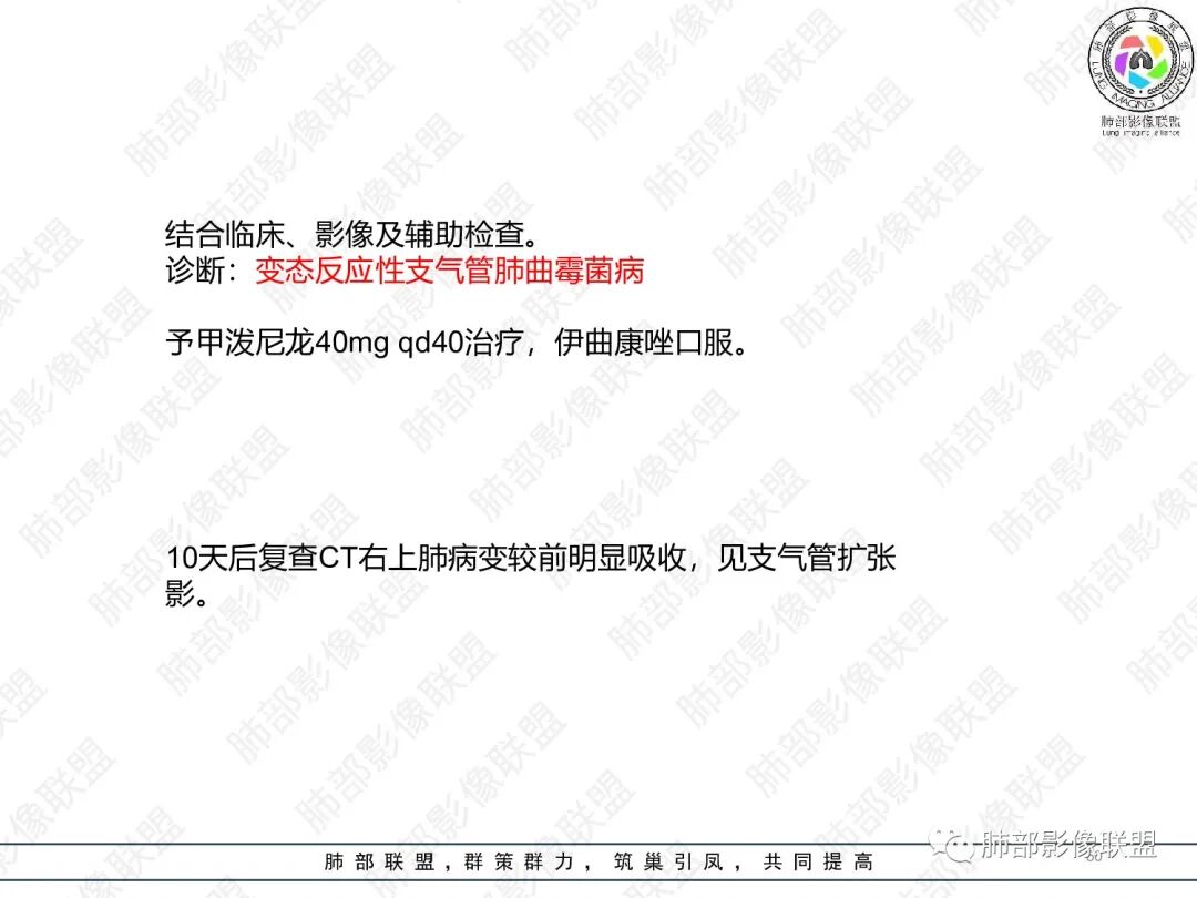 完善气管镜及病理、检验结果(IgE显著增高)等支持ABPA诊断。且给予激素及伊曲康唑治疗后复查胸部CT提示病灶较前吸收,所以诊断明确。