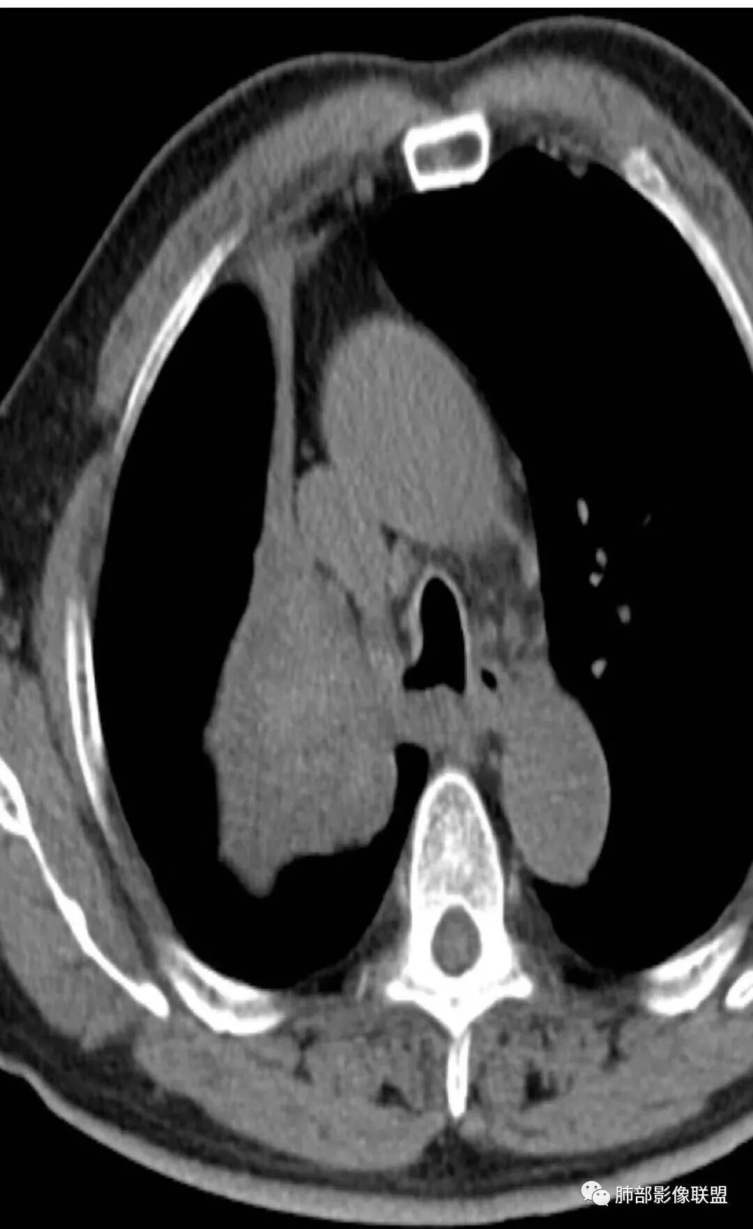 如果鳞癌这么大,破坏力应该很大吧,肋骨会不会受累?当然这例气管壁受累,截断,远端阻塞性肺不张,还是符合中央型肺癌,特别是鳞癌的