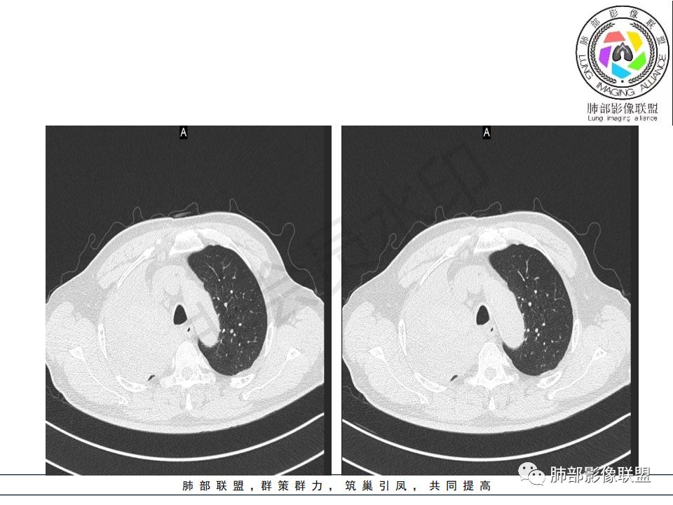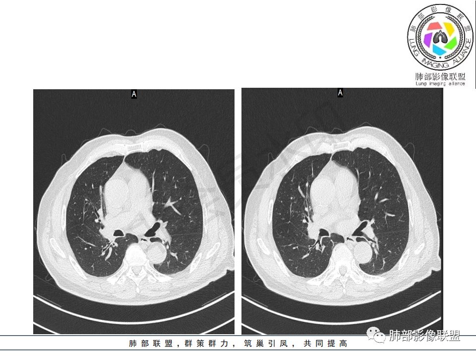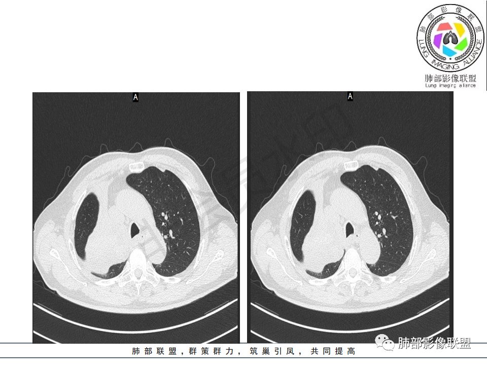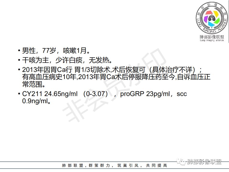 病史:男.77岁,咳嗽1月;干咳,少许白痰,无发热,2013胃癌术后,角蛋白24.65(0-3.07),SCC和proGRP不高;