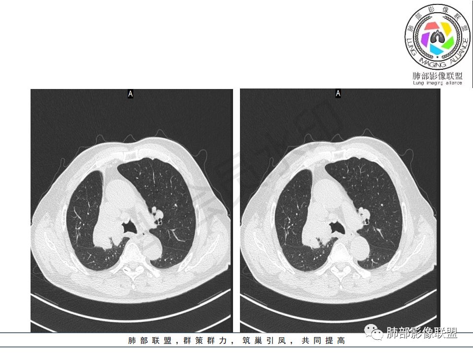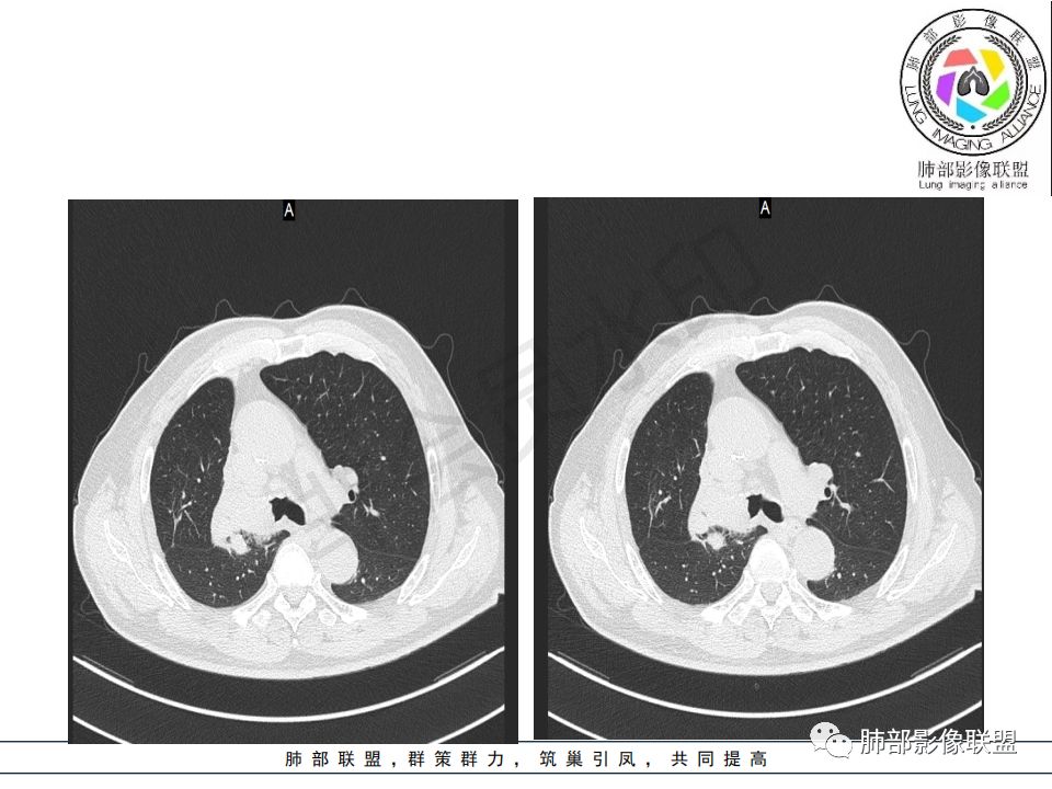 晨读病例:老年男性,症状轻,右侧胸廓略塌陷,右肺主支气管内外软组织影,支气管变窄截断,右肺上叶不张,其内见细砂样钙化,周围看见小结节,右肺门看见一淋巴结稍大,增强不均匀强化,胃癌病史,常规考虑:转移,或原发肺恶性鳞癌。鉴别支气管TB?