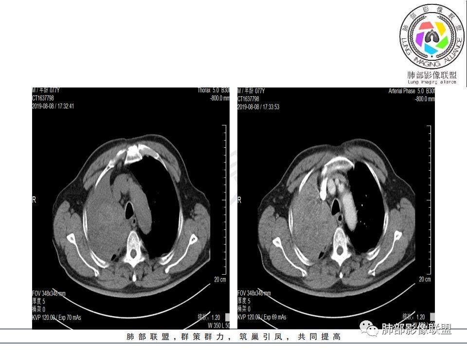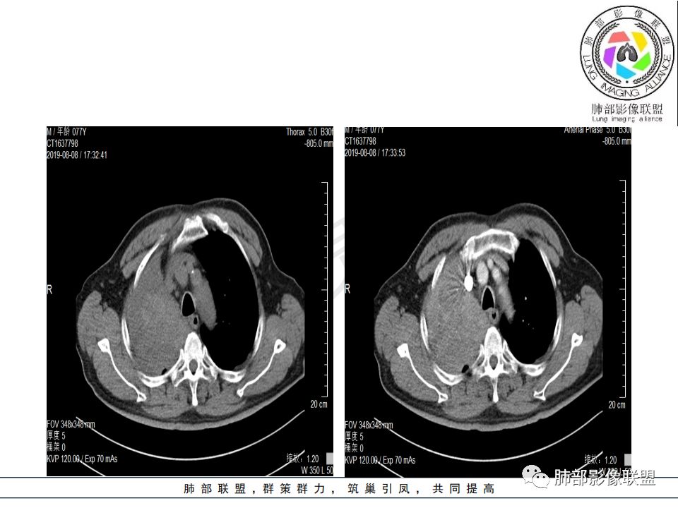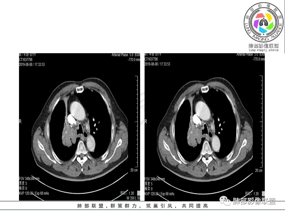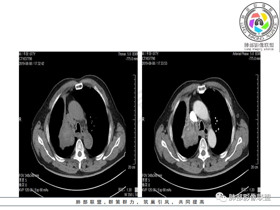 影像:影像右侧大支气管阻塞,临床没有症状或很轻微,要想到胃腺癌转移;胸壁代偿好,透亮度稍低不明显,慢性过程;34.8-52.5HU,主病灶支气管前壁另有1结节,都做成增强两期了,动脉期较平扫有强化;