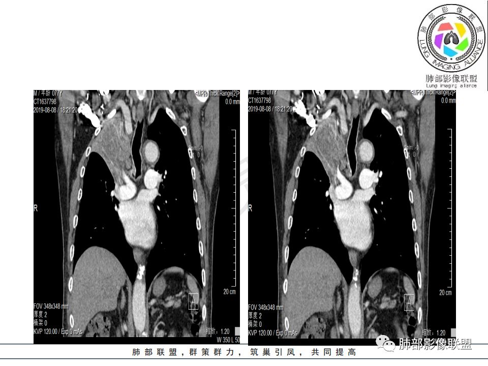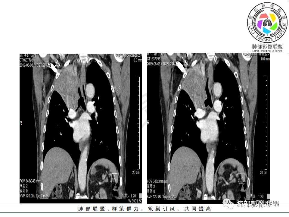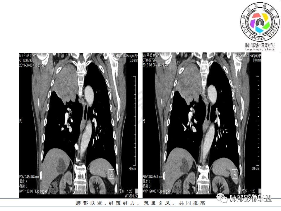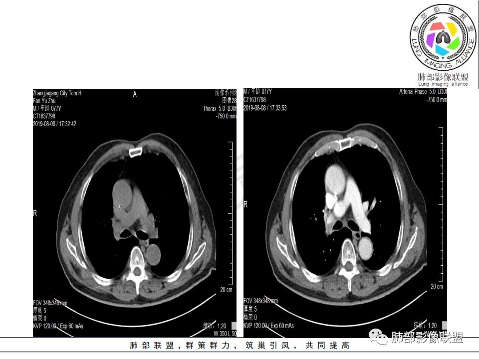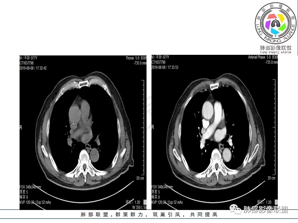 影像:影像右侧大支气管阻塞,临床没有症状或很轻微,要想到胃腺癌转移;胸壁代偿好,透亮度稍低不明显,慢性过程;34.8-52.5HU,主病灶支气管前壁另有1结节,都做成增强两期了,动脉期较平扫有强化;