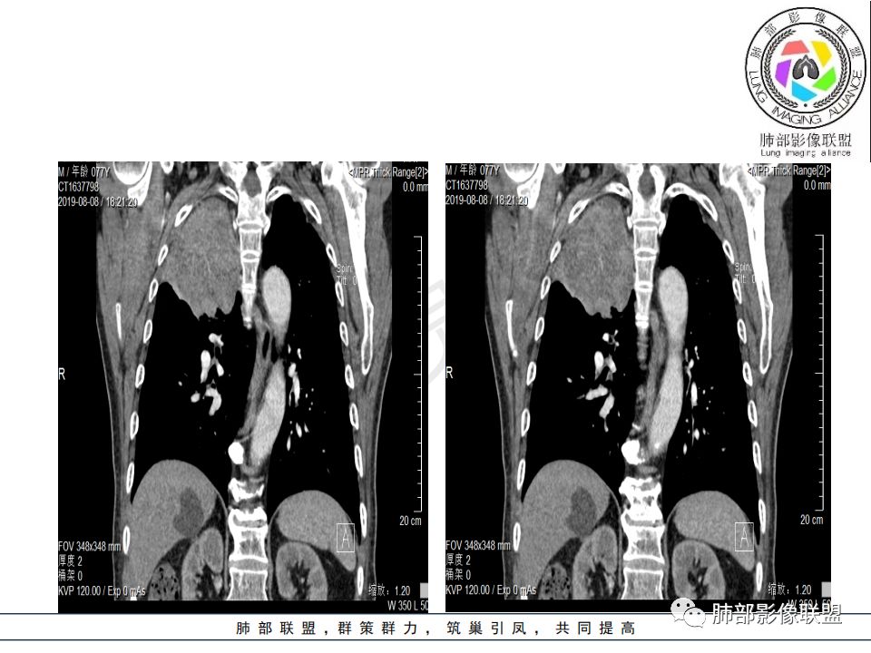 从强化情况和冠状位看主要还是从外向内的一个肿块,有不张,但不张范围不大,近端支气管堵塞,考虑腺癌或类癌(原发或转移都可能),鉴别鳞癌。
