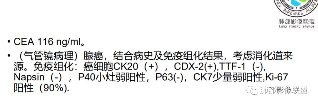 病理主要是通过CK7,CK8(支持肺原发),CK20消化道腺癌特异标志物来鉴别