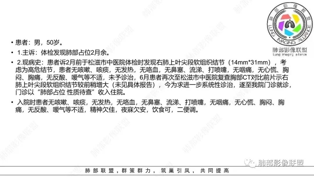 中年男性,右肺上叶尖段不规则实性病灶,边缘多深分叶局部形似并见数条长毛刺,与胸膜面数条牵拉中年男性,右肺上叶尖段不规则实性病灶,边缘多深分叶局部形似枫叶,侧胸膜局部幕状增厚,病灶增强后不均匀中等强化。考虑恶性肿瘤,腺癌可能,鉴别炎性肉芽肿(结核)、炎性肌纤维母细胞瘤。