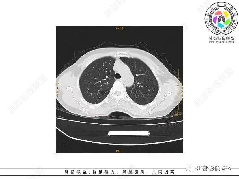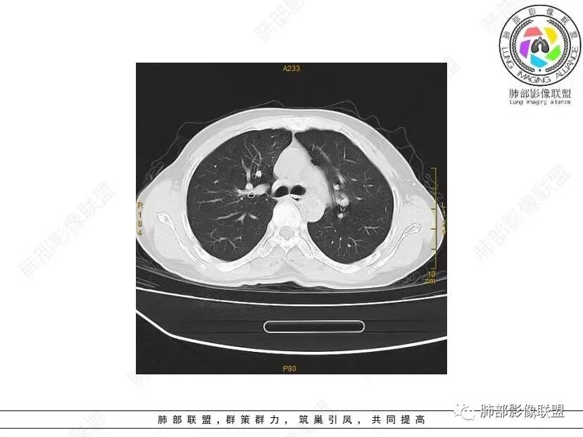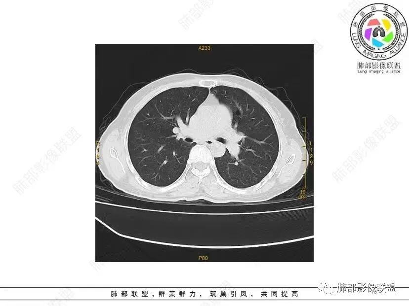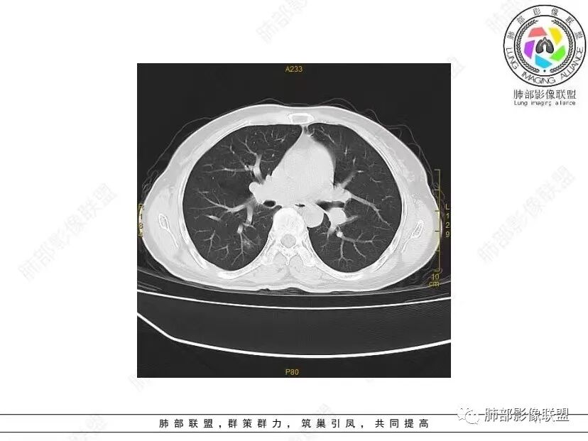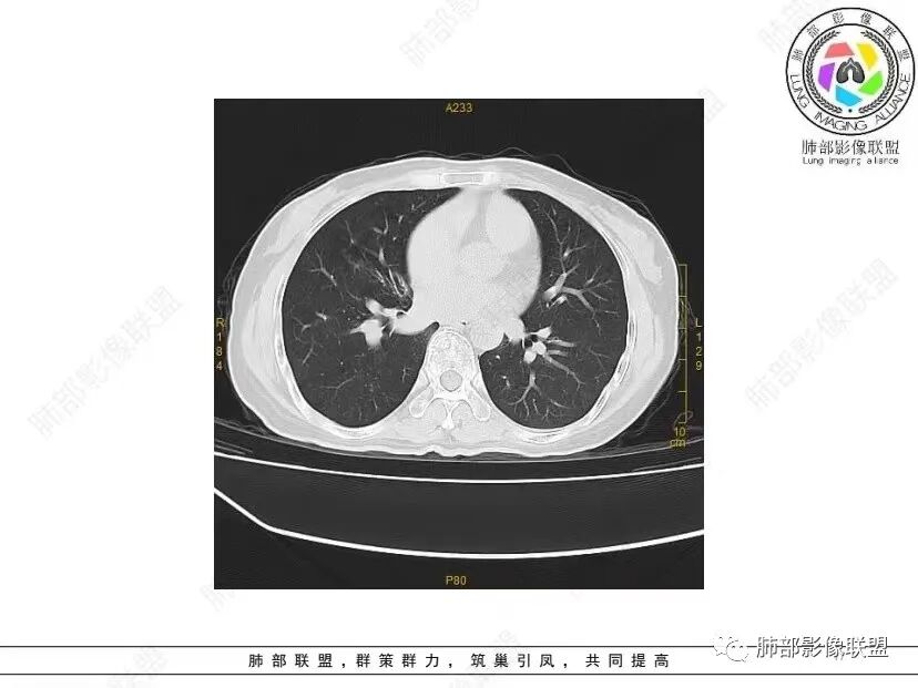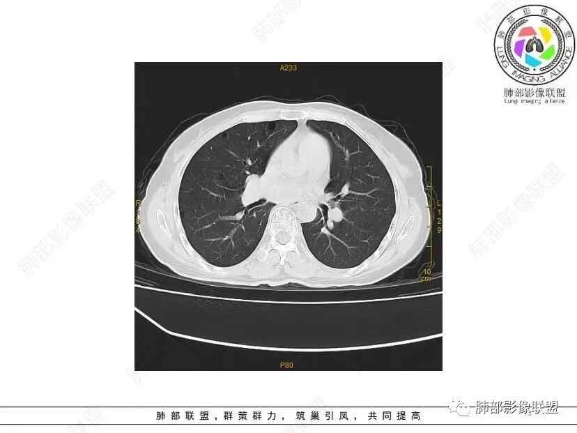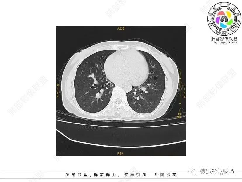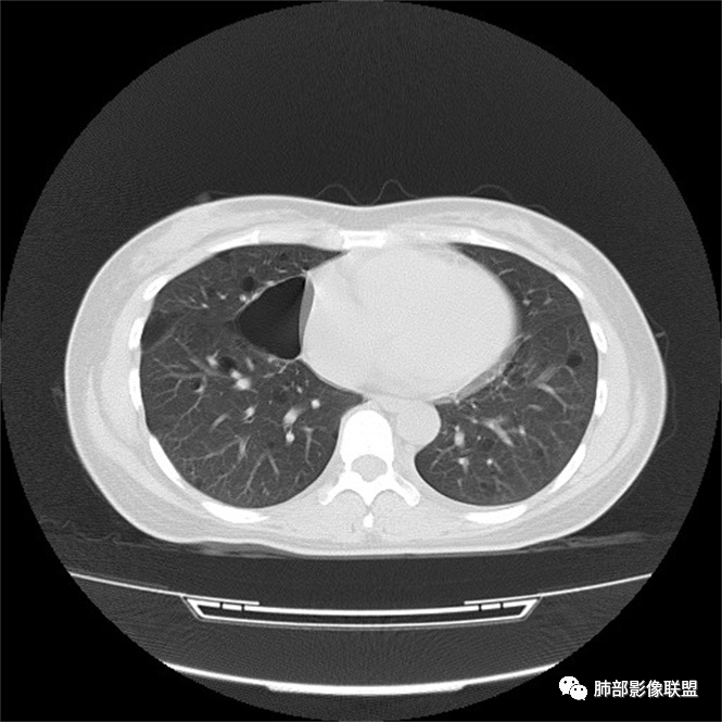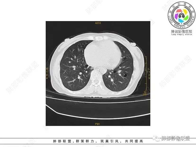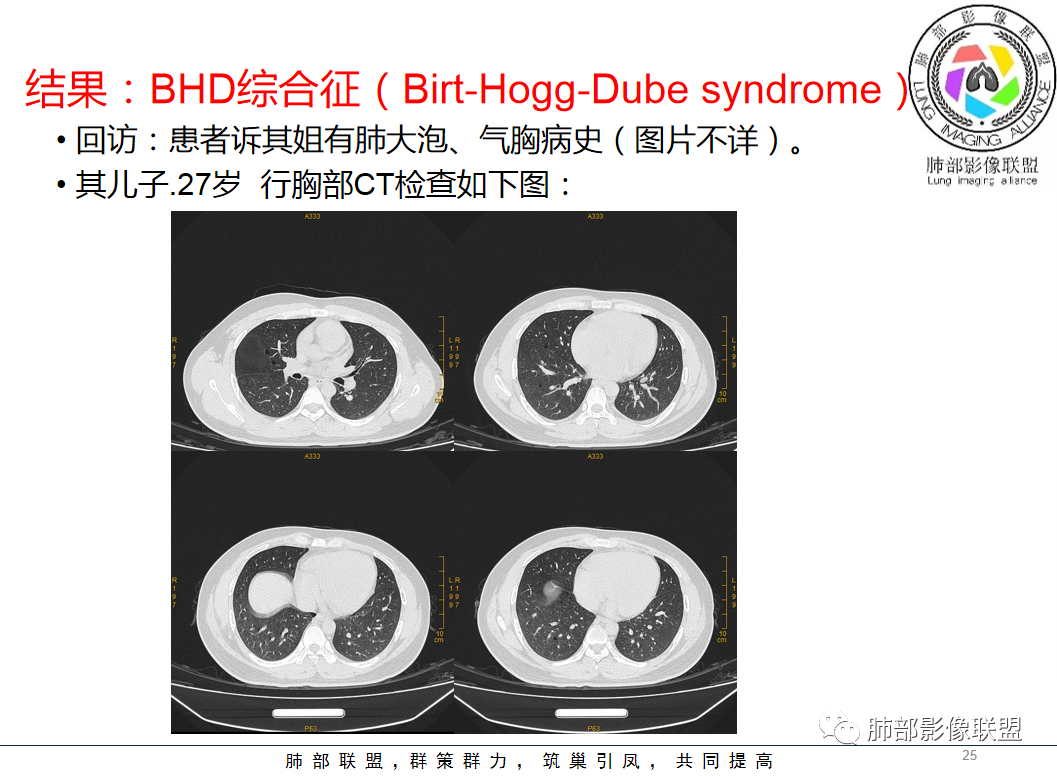 红日初升: 中年女性,双肺多发气囊,背景干净,大小不一,下肺韧带旁较大,考虑BHD,鉴别LIP、LAM