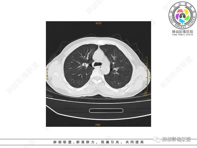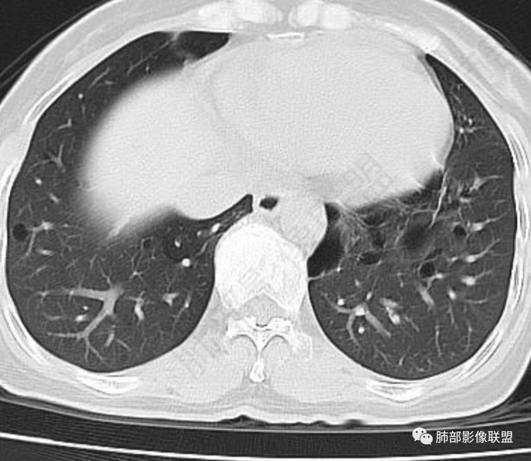 CT表现:双肺散在多发薄壁囊腔和小叶中心结节,囊腔沿血管支气管束周围间质分布,周围有磨玻璃密度影(反应出弥漫性间质炎症),小叶间隔和支气管血管束增厚。