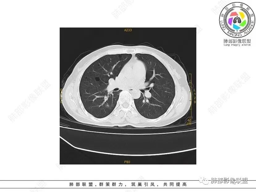 宇宙: 中年女性,两肺多发大小不等薄壁囊状影,两肺纵膈胸膜下分布明显,考虑BHD,鉴别LAM