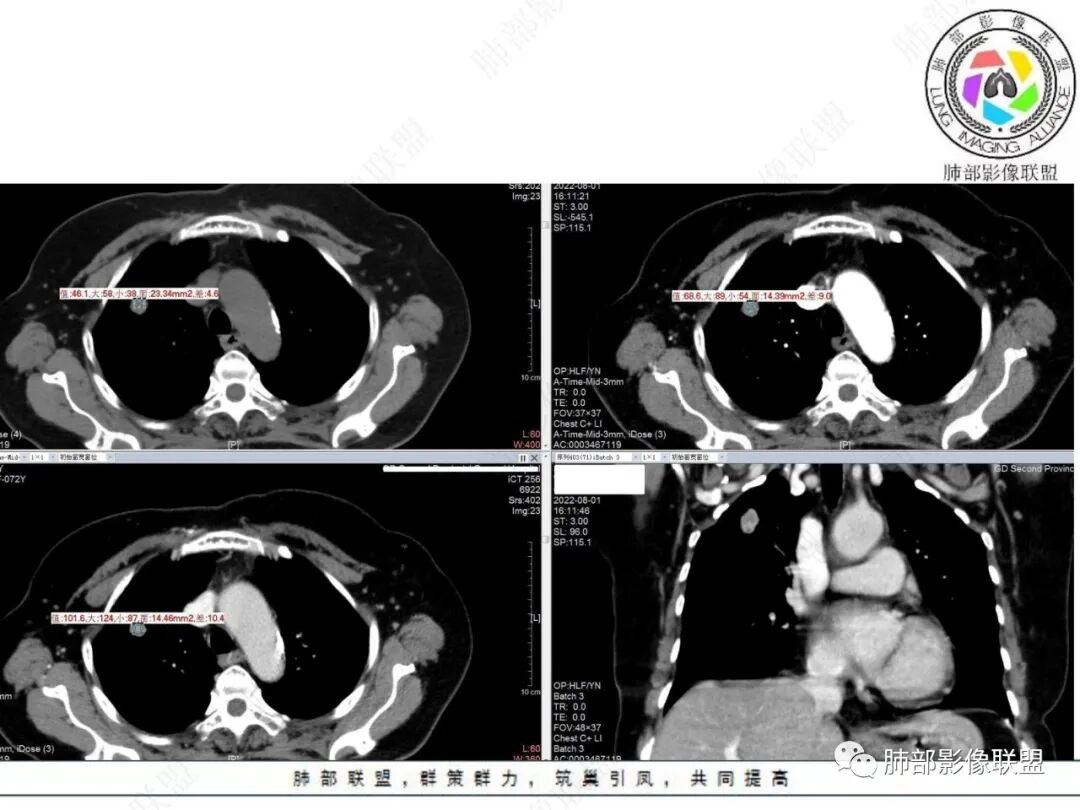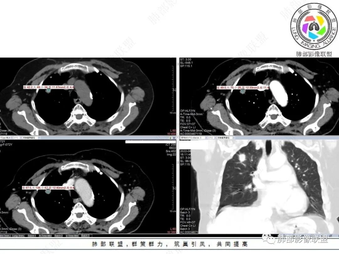 右肺上叶结节看着就挺恶的,血管集束、冠状位看到一条血管弯曲,可疑空泡,周围似乎有磨玻璃?(需要薄层明确),这些征象支持腺癌。但是病灶比较明显的延迟强化、环形强化,毛刺比较长且收缩力不是太明显,炎性肉芽肿还是要考虑。