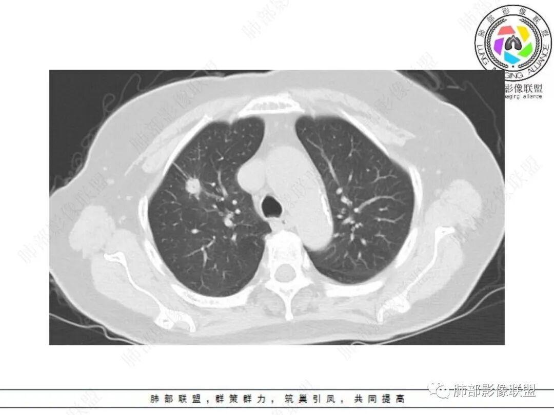 老年女性,右肺上叶孤立实性结节,边缘欠光整,强化明显,未见卫星灶,已经让人高度警惕恶性肿瘤,尤其是腺癌!