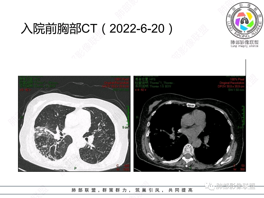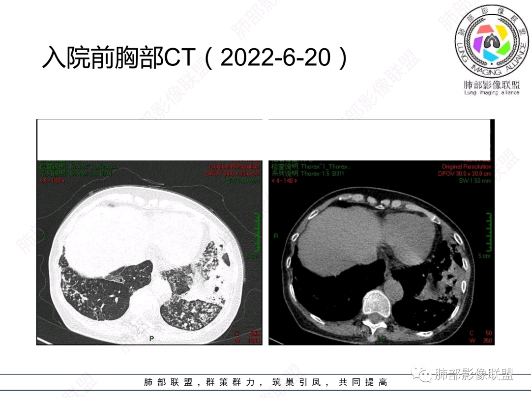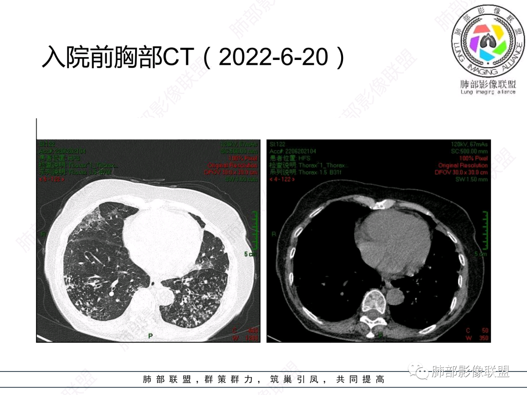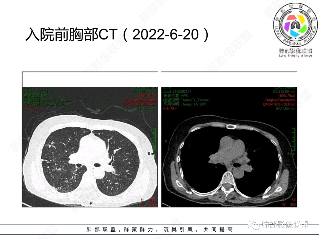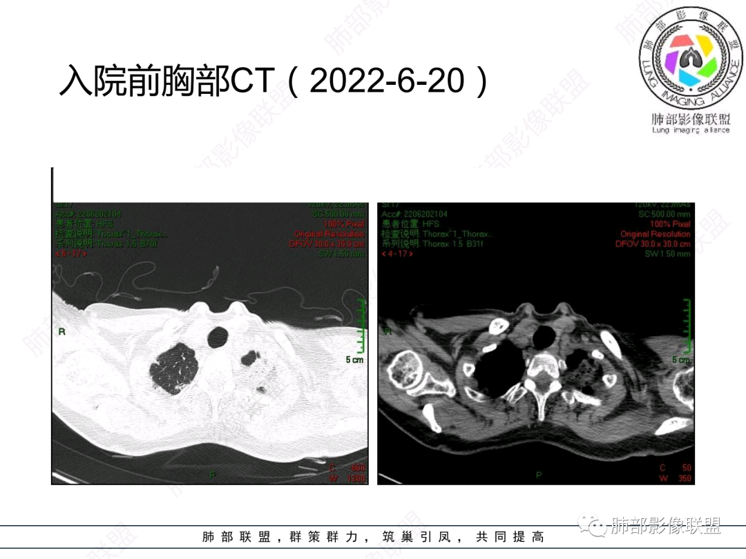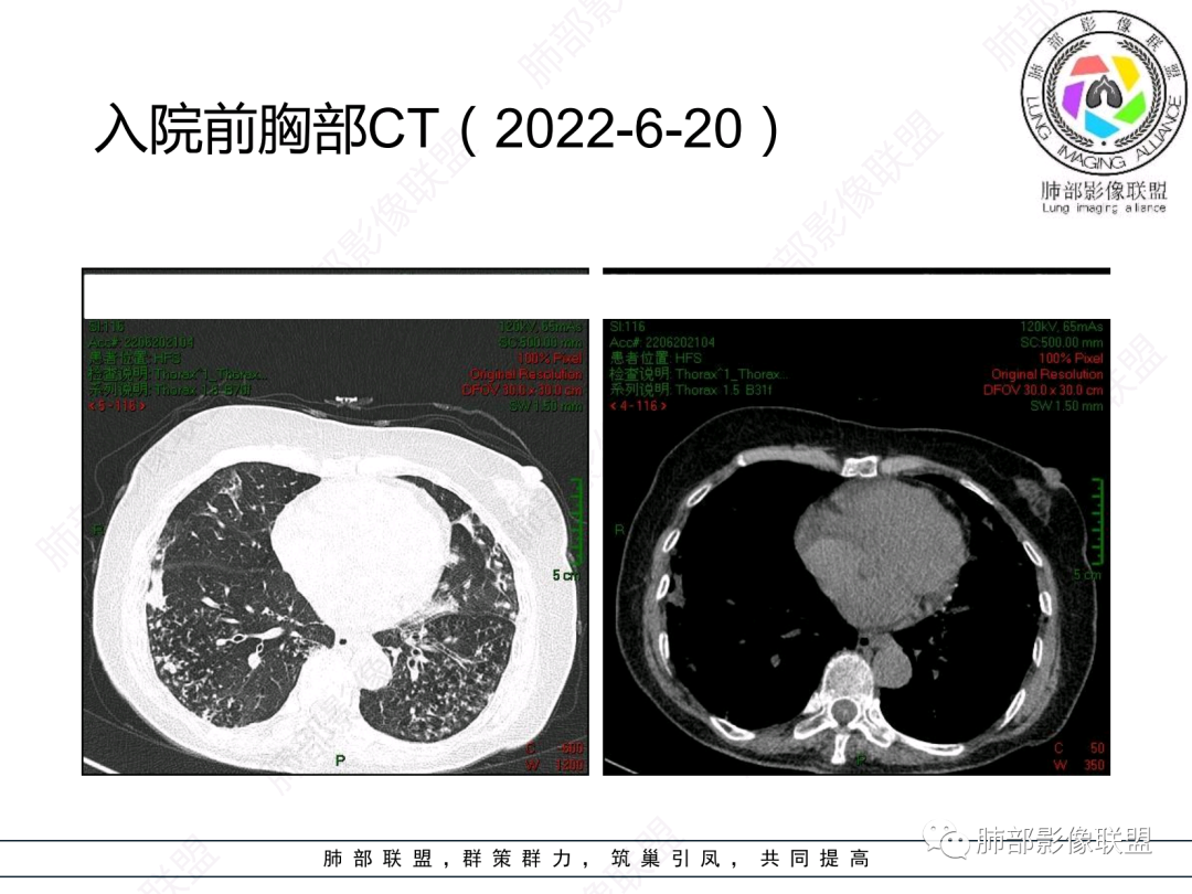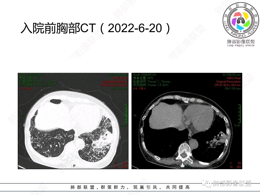 老年女性,慢性咳嗽咳白色粘液痰史,近期加重老现,2017年11月9日和2022年6月20日对比,如果左肺下叶胸膜下片状实边影位置固定,内见假大空征,支气管有扭曲扩张,周边小结节感,提示粘液腺Ca可能;两肺叶多发弥散小树丫影,除右肺中叶相对分布较少外,沿支气管束外周分布为甚,相应累及支气管略增厚,影像重与临床轻分离特点,考虑NTM,支气管镜肺泡灌洗液mNGS检查。