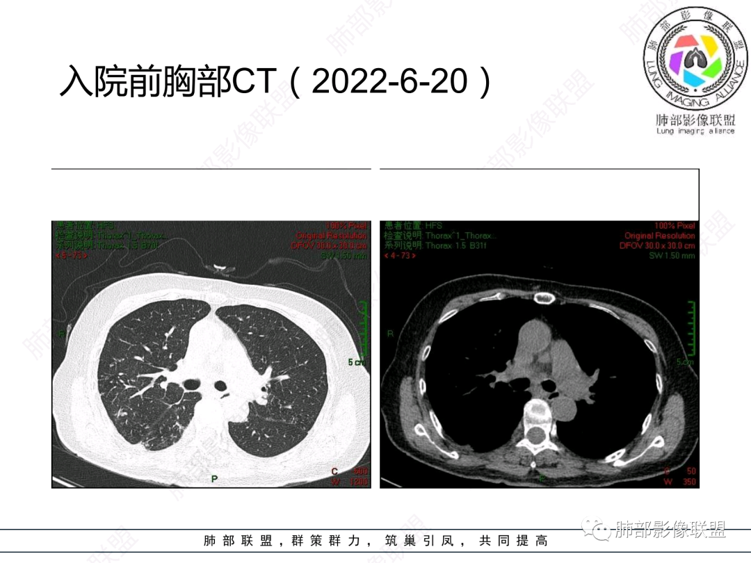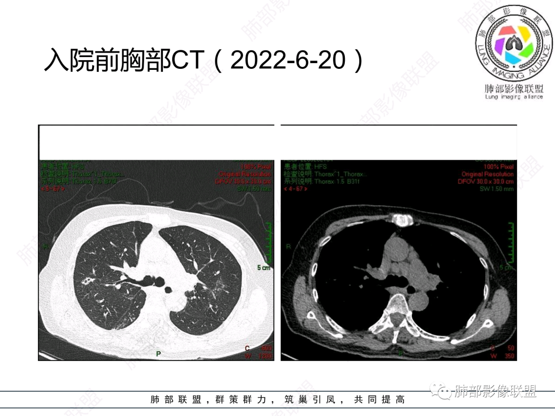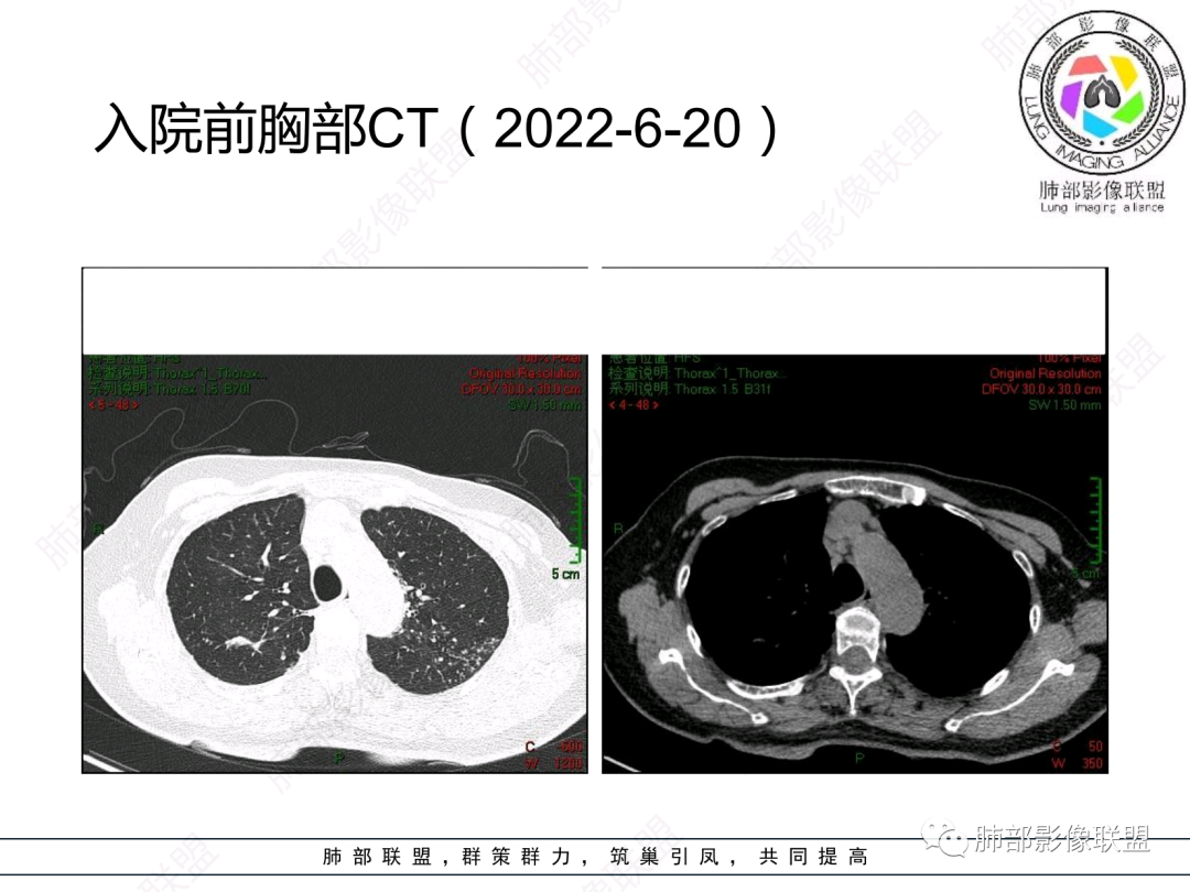 两肺支气管管壁增厚伴多发结节、树芽,两下肺明显,边缘模糊,左肺上叶及下叶团片,其内支气管扩张及空洞,纵隔淋巴结肿大,考虑NTM,鉴别曲霉