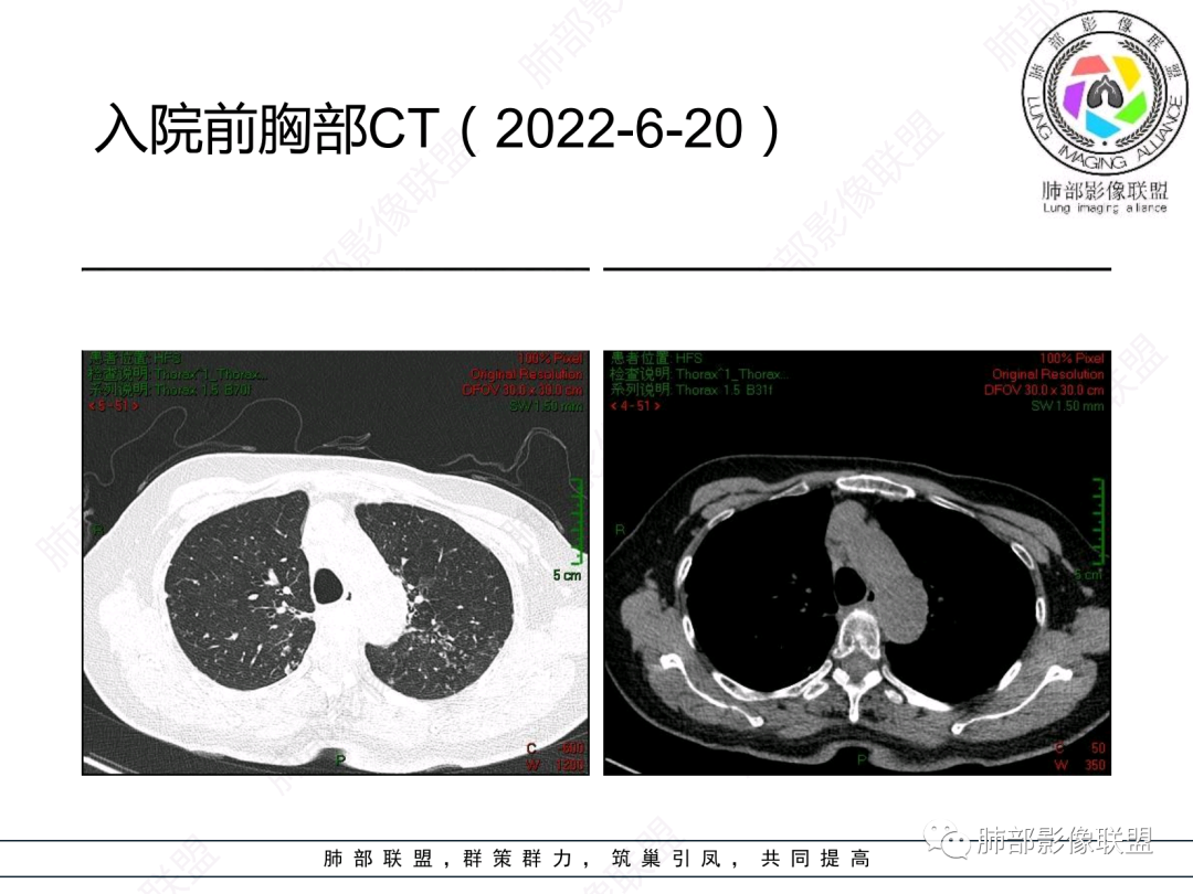 DPB的典型HRCT表现为边缘模糊的小叶中心性结节和树芽征,弥漫性分布,肺野周围基底部分布为著。