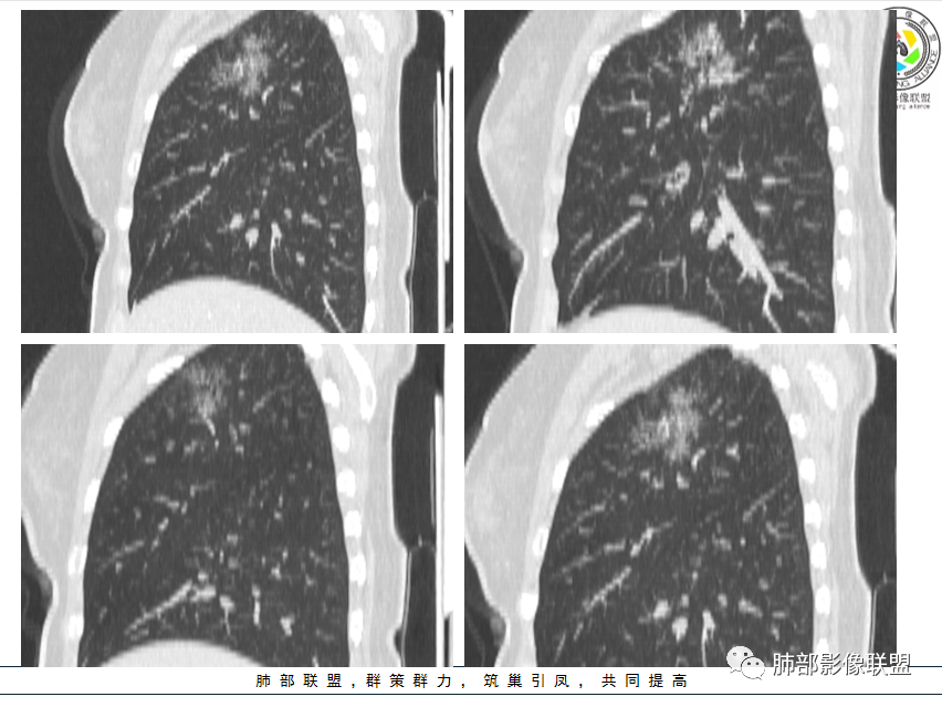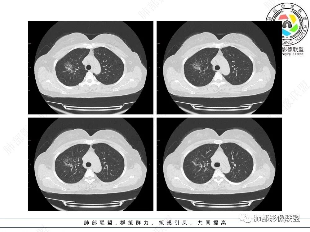 影像特点:右肺上叶混合磨玻璃影,边界清晰,结构松散,内有多结节堆积及支气管扩张影,可见小叶间隔增厚,并局部增厚的小叶间隔上亦存在微结节,胸膜侧可见纤细索条,病灶周围可见多发微结节影。