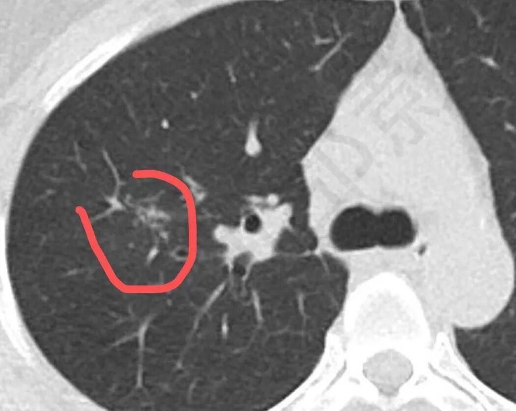 女,52岁,体检发现,右肺上叶尖段混合磨玻璃密度影,形态不规则,内部支气管血管穿行,胸膜牵拉,远侧端可见卫星灶,考虑结核