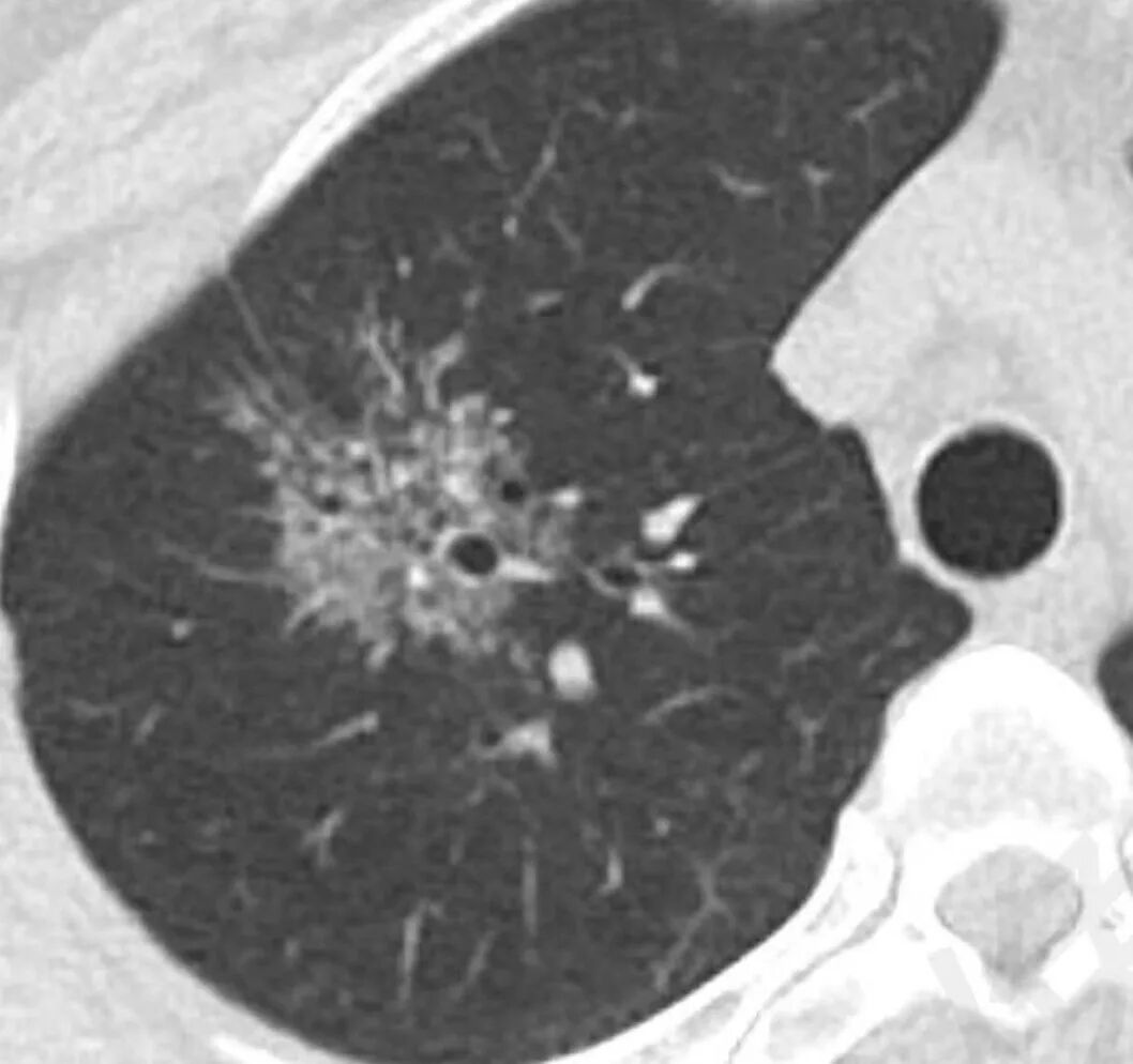 右肺上叶不规则磨玻璃密度结节(内小结节堆积感明显),边缘清,内可见扩张支气管,见胸膜牵拉,牵拉线纤细、柔软,右肺中叶斑片影,左下肺胸膜下多发小结节。首先考虑结核,鉴别腺癌。
