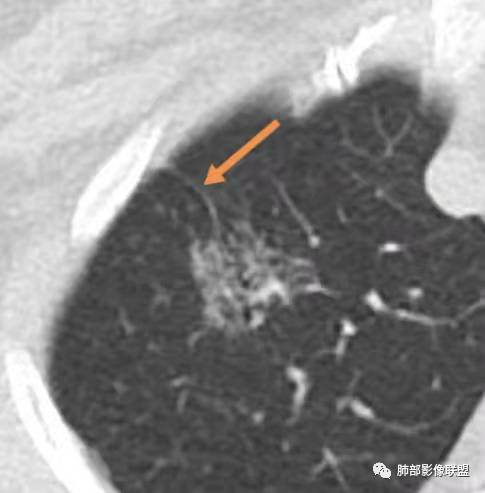 磨玻璃结节,边缘清晰,索条,外缘小结节,考虑结核,鉴别腺癌。