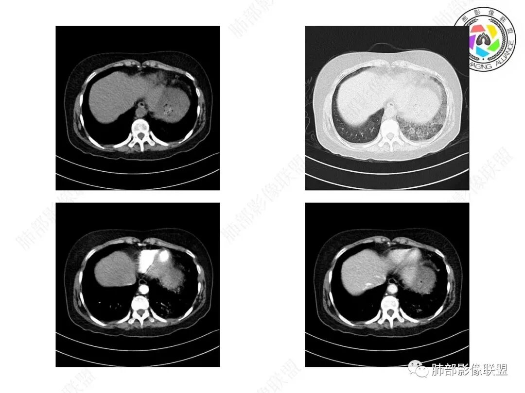 患者,女性,57岁。咳嗽1月、咳痰4天,亚急性病史,抗炎效果不佳,体温不高,痰为白色黏痰,白细胞稍高,主病灶在左下叶,实变+GGO,其余肺也有GGO,伴随有结节。