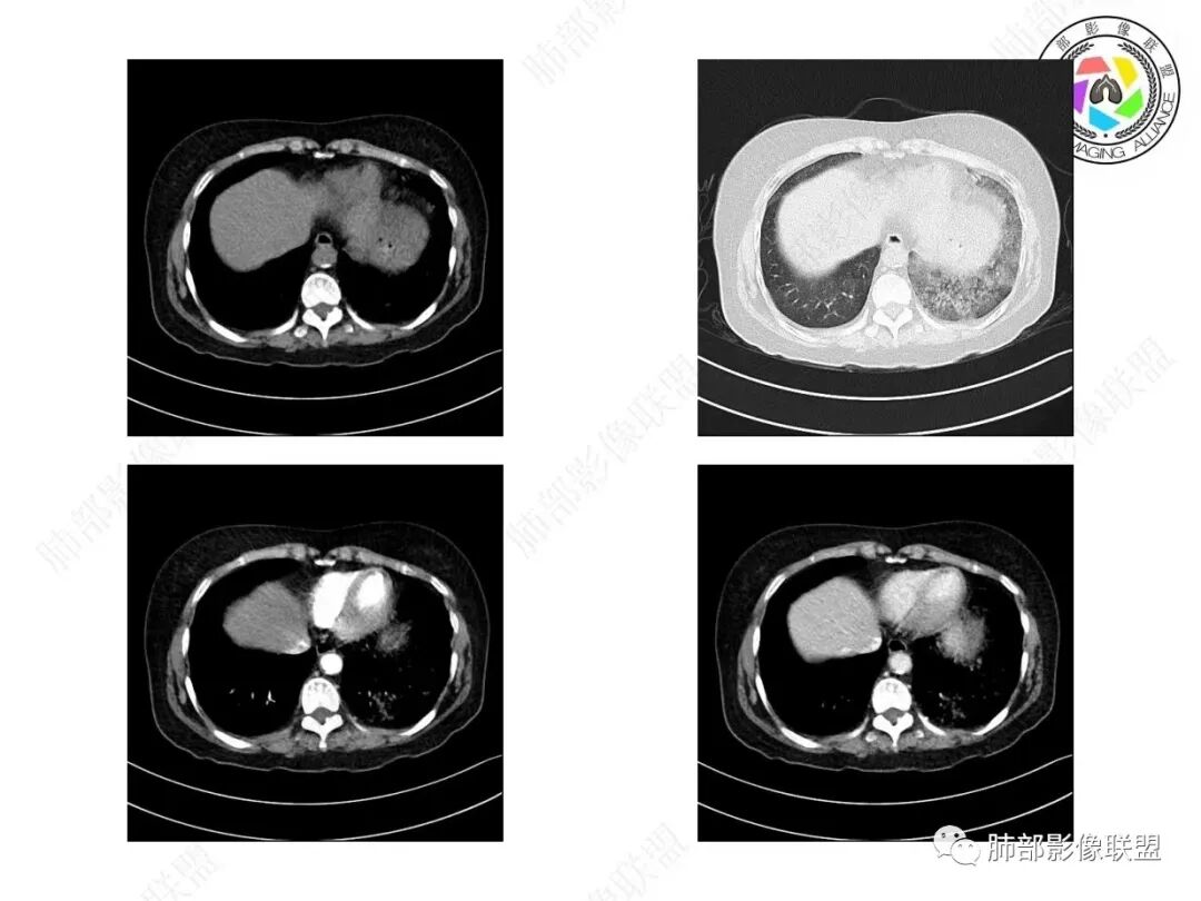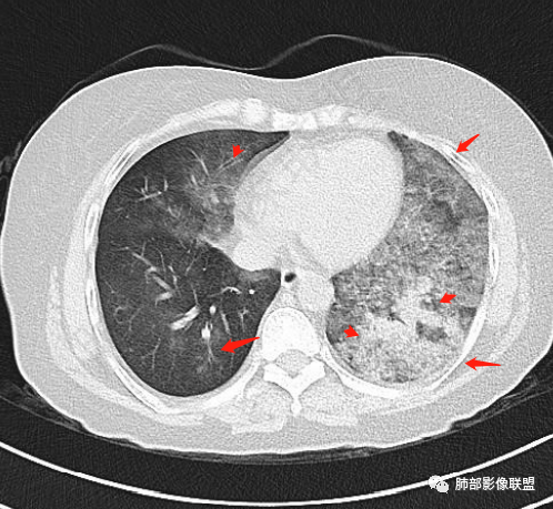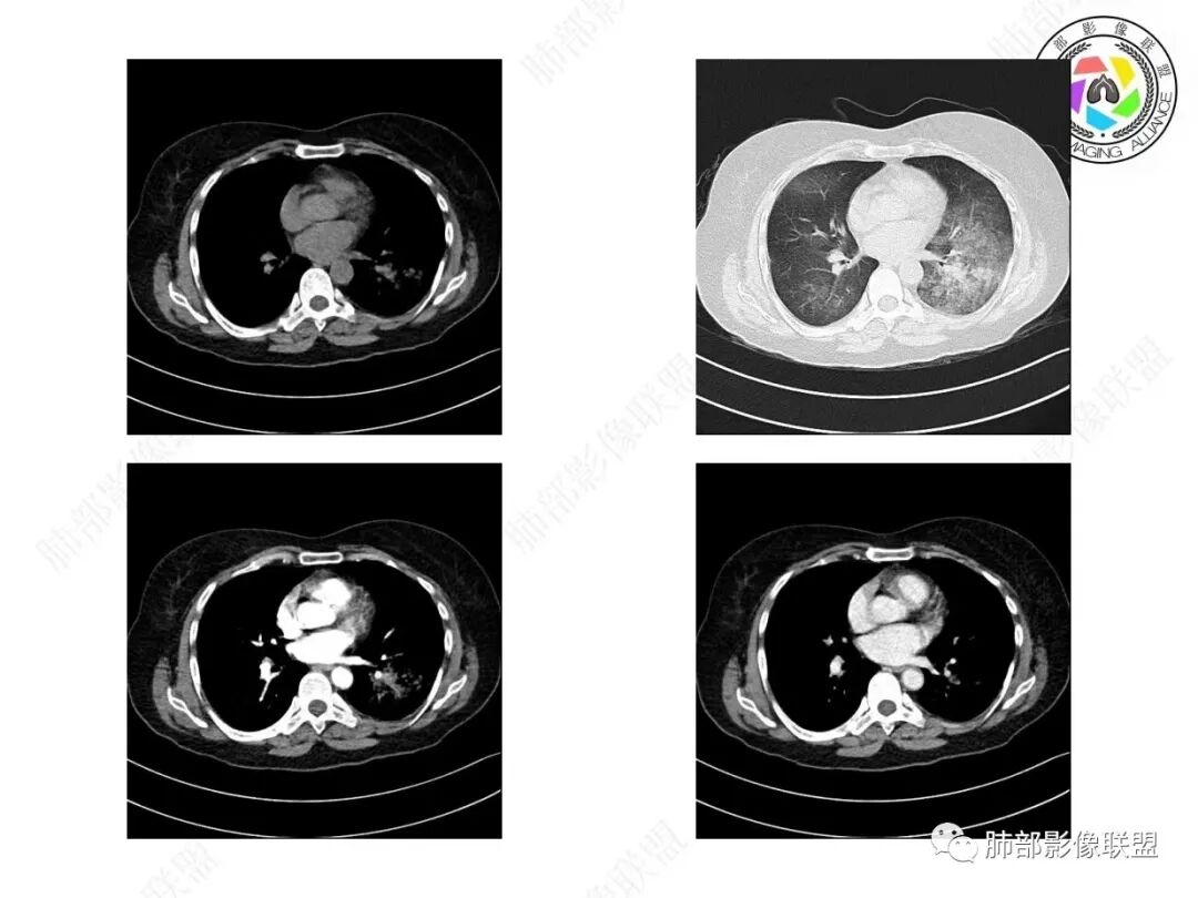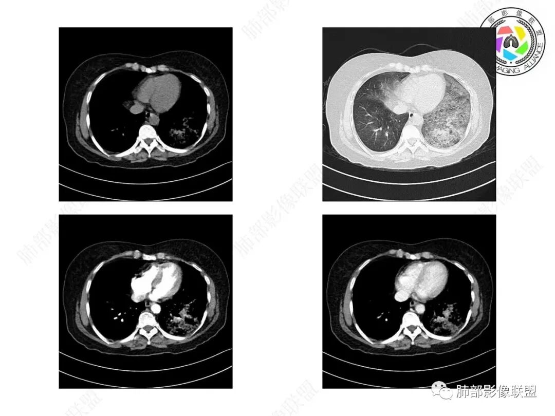 秦化君:老年女性,一月病史。双肺广泛不均匀分布磨玻璃影,边缘部分模糊,左下肺实变,密度不均。考虑:1.感染性病变PCP。2.非感染血管炎。