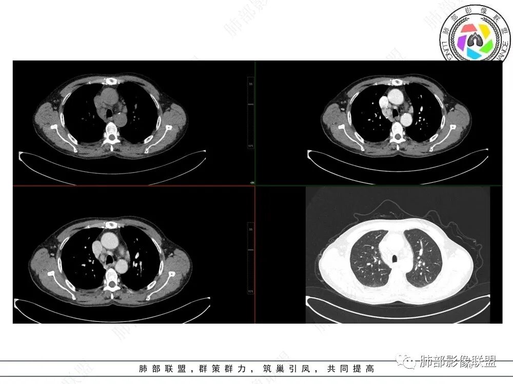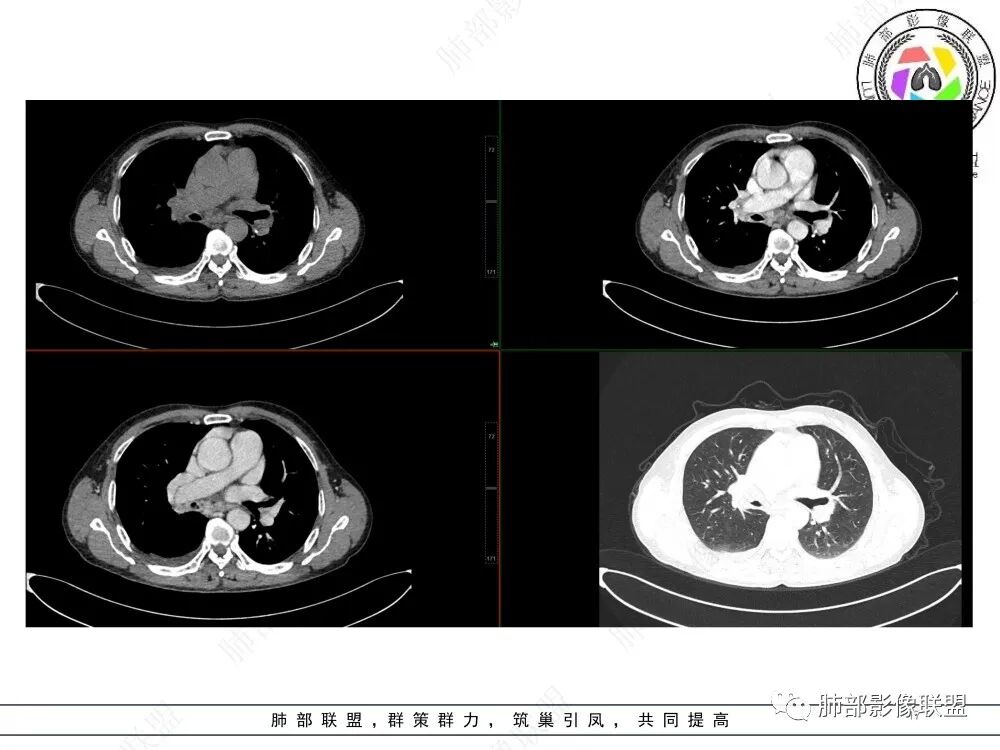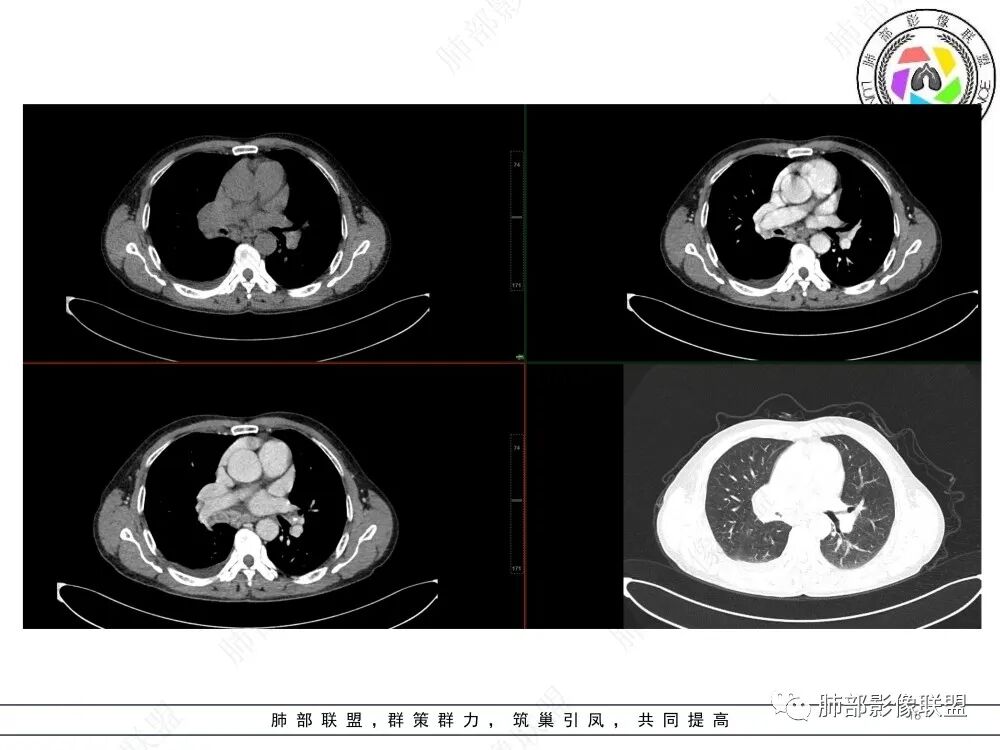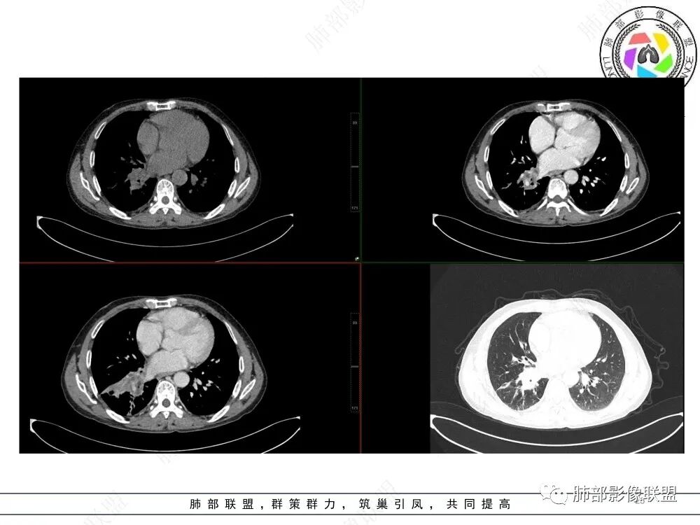 魏俊明:单侧胸水,多发肿大淋巴结,强化均匀,右肺下叶支气管壁增厚,强化比较轻,恶性病变可能,首先考虑粘液表皮样癌。鉴别支气管内膜结核。