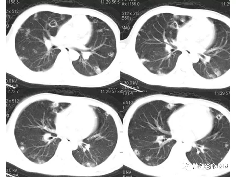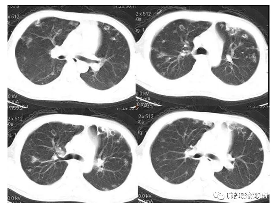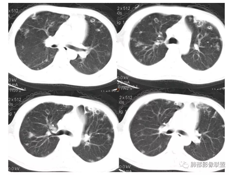 南边:青年男性,急性起病,多发结节或囊腔——胸膜下分布结节,与支气管关系不密切,支气管壁不增厚,首选血道来源,不是气道来源