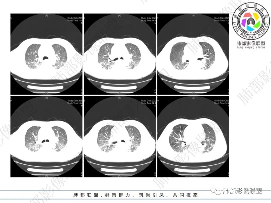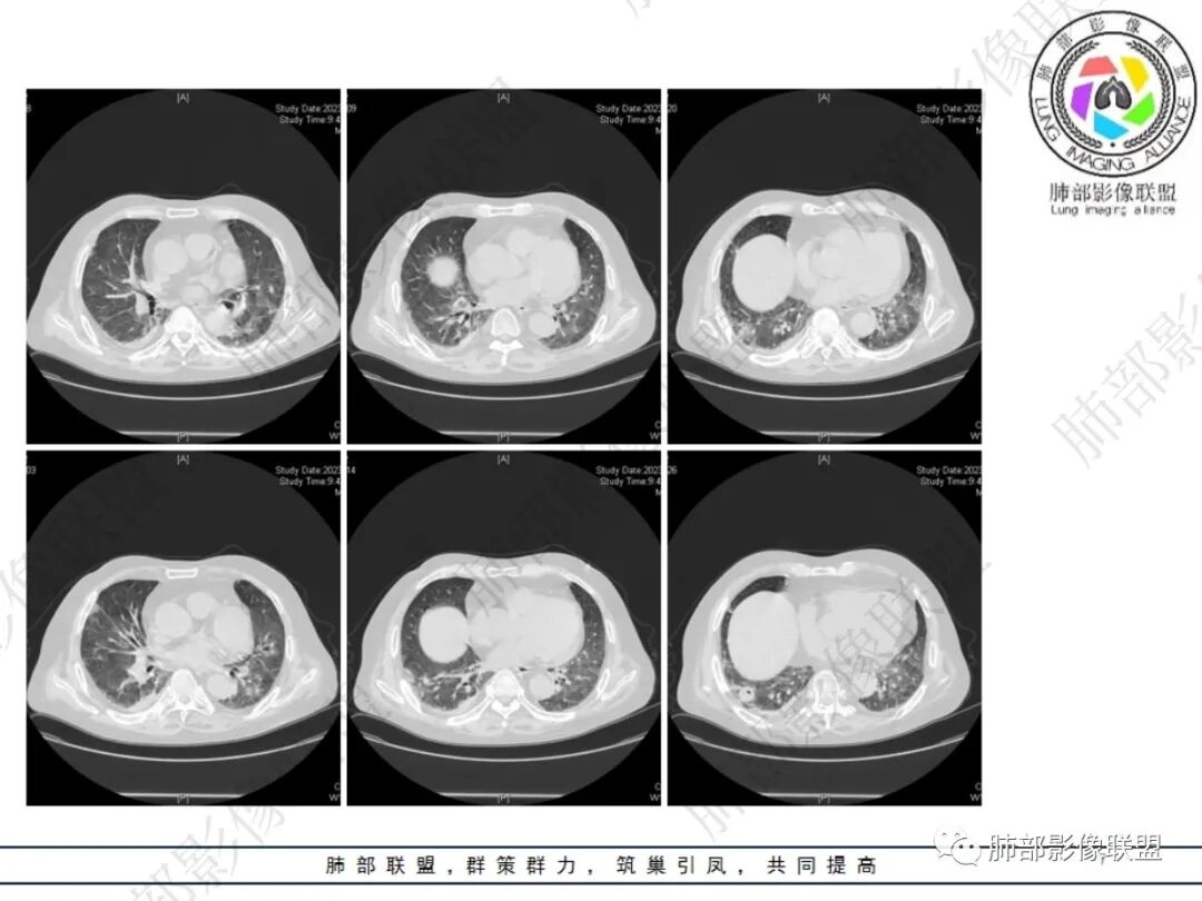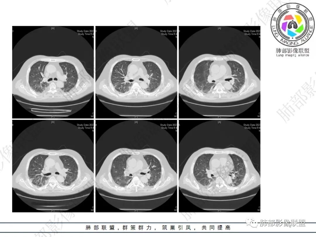 ①局限或弥漫肺部浸润影,可为GGO、斑片影、大部分以实变为主。