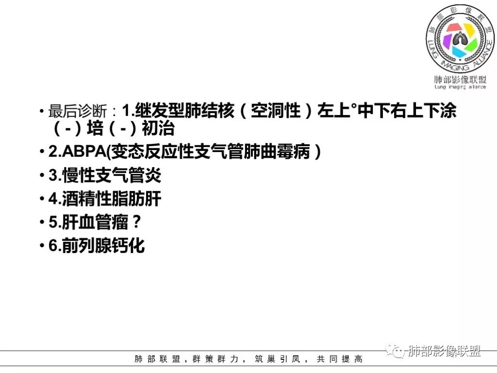 2.本例病程相当长,主要病损固定,肺部病变经抗结核治疗好转后,空洞有变化,短期内部分病灶此起彼伏,应考虑到合并新发病变可能。