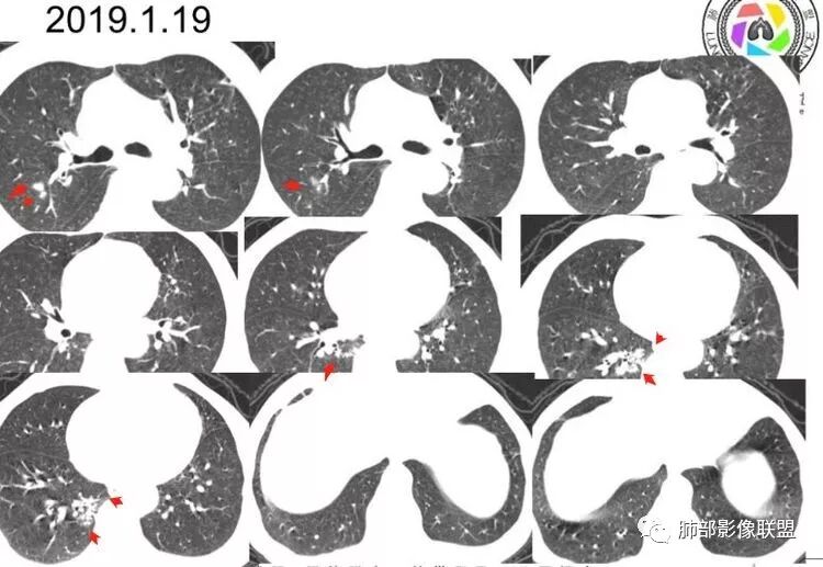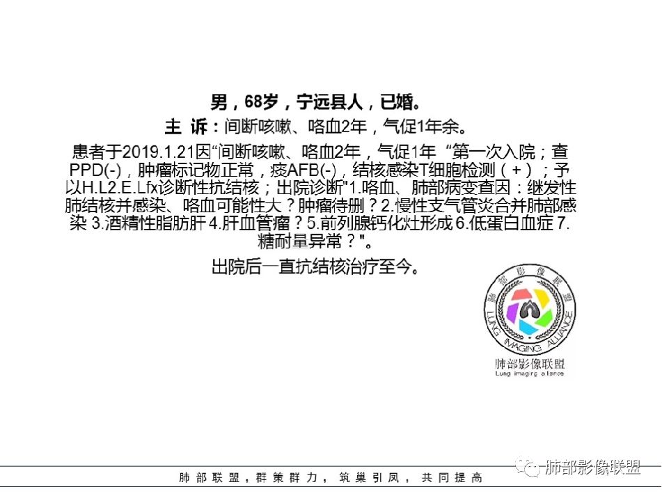 1.本例双肺多发病灶,边界较清楚的结节、树芽、薄壁异形空洞影……病灶符合典型继发性肺结核影像改变。