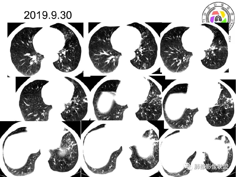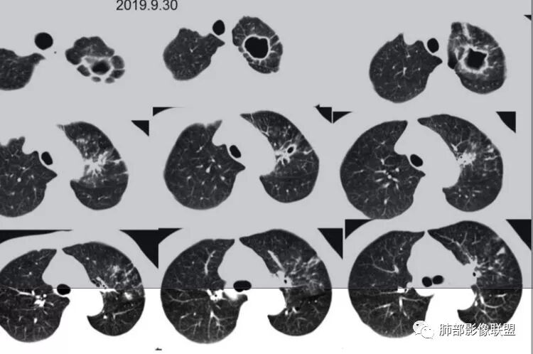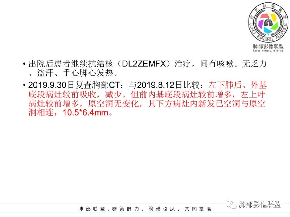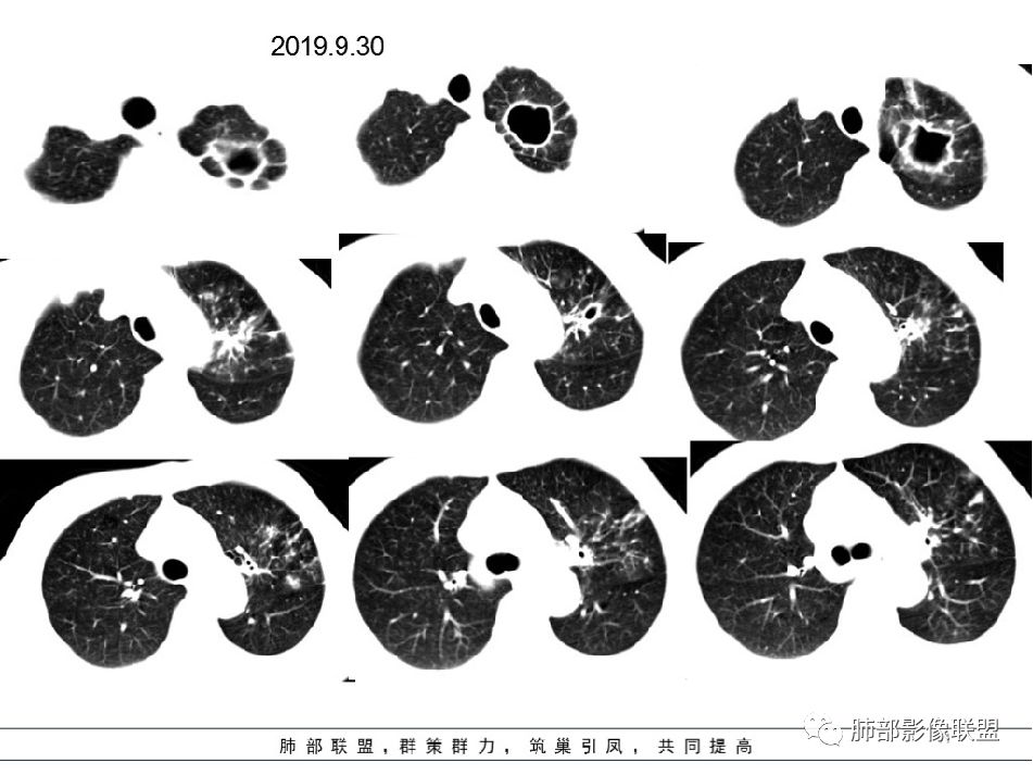 2019--9-30复查CT:与2019-8-12比较,左下肺后外基底段较前吸收减少。(有效)但前内基底段病灶较前增多,原空洞无变化,其下方病灶内新发空洞与原空洞相连,10.5*6.4mm,(小空洞),(无效?)。